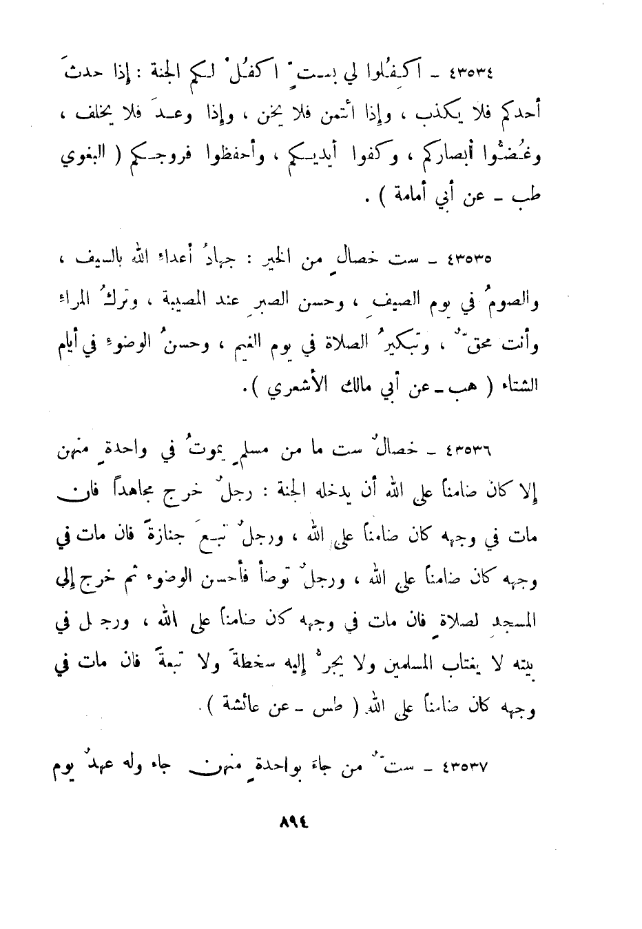 43534- اكفلوا لي بست أكفل لكم الجنة: إذا حدث أحدكم فلا يكذب، وإذا ائتمن فلا يخن، وإذا وعد فلا يخلف، وغضوا أبصاركم، وكفوا أيديكم، وأحفظوا فروجكم."البغوي طب - عن أبي أمامة".