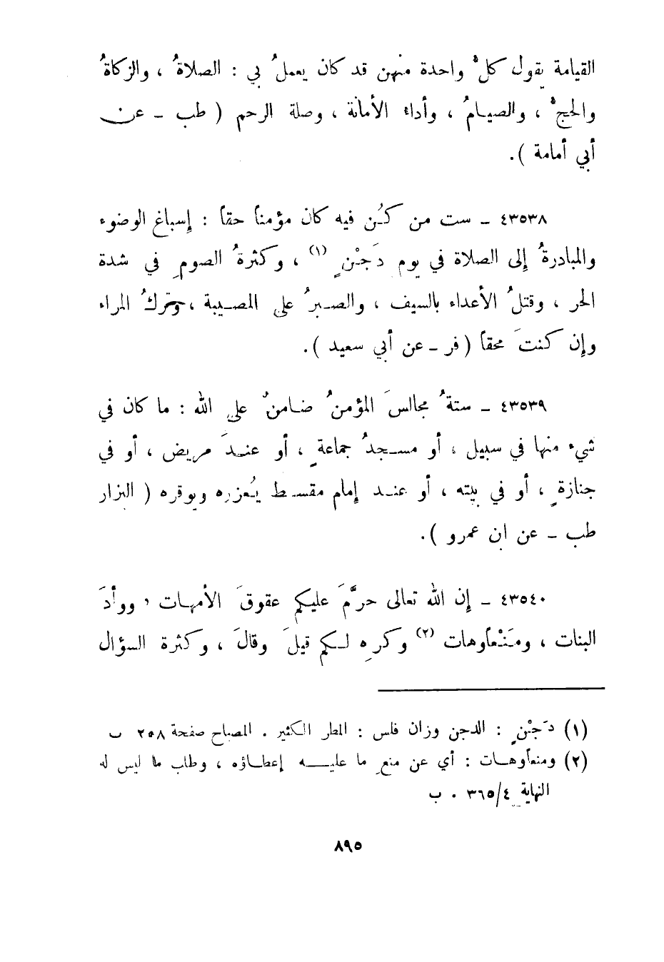 43538- ست من كن فيه كان مؤمنا حقا: إسباغ الوضوء والمبادرة إلى الصلاة في يوم دجن "1، وكثرة الصوم في شدة الحر، وقتل الأعداء بالسيف، والصبر على المصيبة، وترك المراء وإن كنت محقا."فر - عن أبي سعيد".