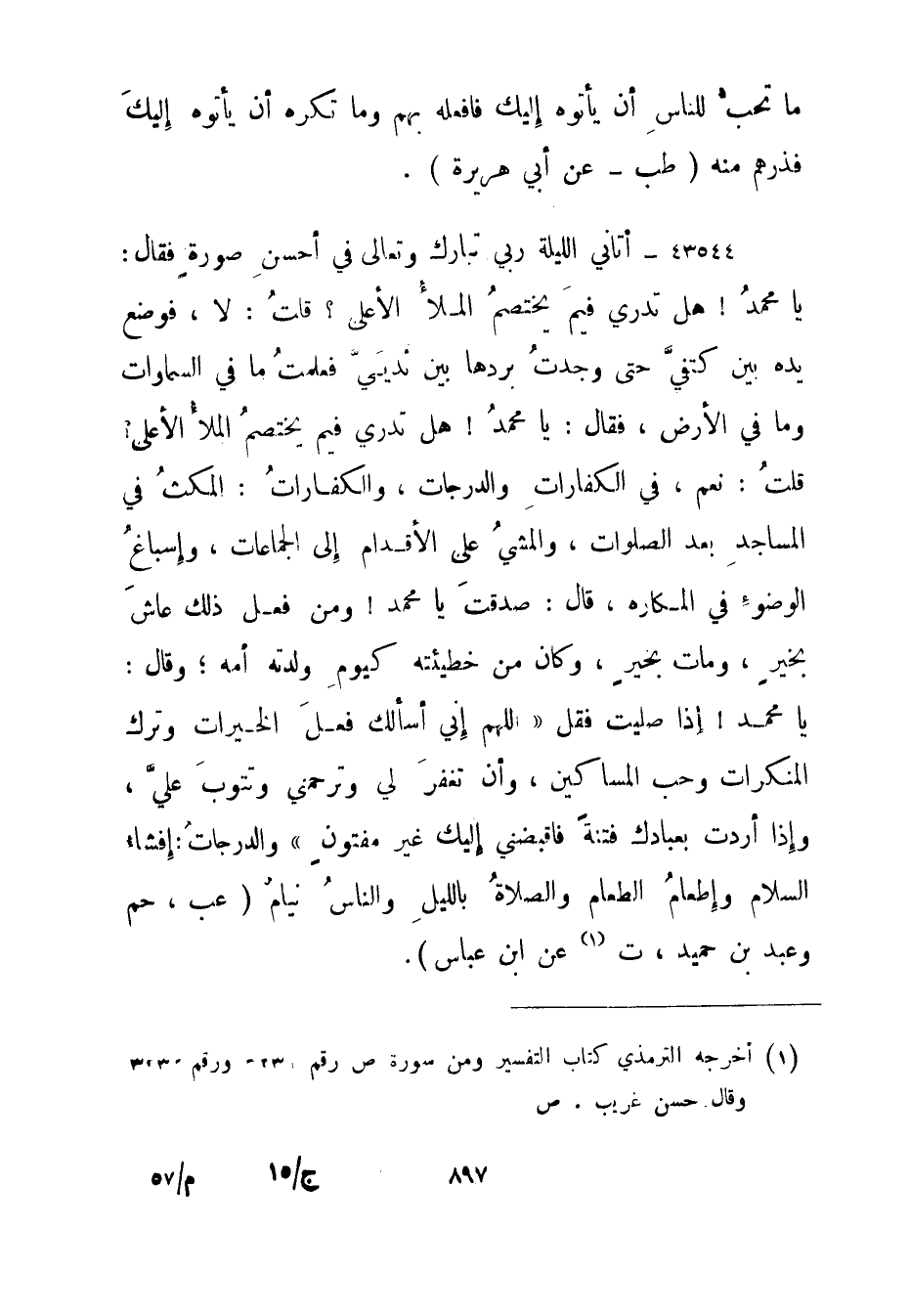 43544- أتاني الليلة ربي تبارك وتعالى في أحسن صورة فقال: يا محمد! هل تدري فيم يختصم الملأ الأعلى؟ قلت: لا، فوضع يده بين كتفي حتى وجدت بردها بين ثديي فعلمت ما في السماوات وما في الأرض، فقال: يا محمد! هل تدري فيم يختصم الملأ الأعلى؟ قلت: نعم، في الكفارات والدرجات، والكفارات: المكث في المساجد بعد الصلوات، والمشي على الأقدام إلى الجماعات، وإسباغ الوضوء في المكاره، قال: صدقت يا محمد! ومن فعل ذلك عاش بخير، ومات بخير، وكان من خطيئته كيوم ولدته أمه؛ وقال: يا محمد! إذا صليت فقل "اللهم إني أسألك فعل الخيرات وترك المنكرات وحب المساكين، وأن تغفر لي وترحمني وتتوب علي، وإذا أردت بعبادك فتنة فاقبضني إليك غير مفتون" والدرجات: إفشاء السلام وإطعام الطعام والصلاة بالليل والناس نيام."عب، حم وعبد بن حميد، ت "1" عن ابن عباس"."