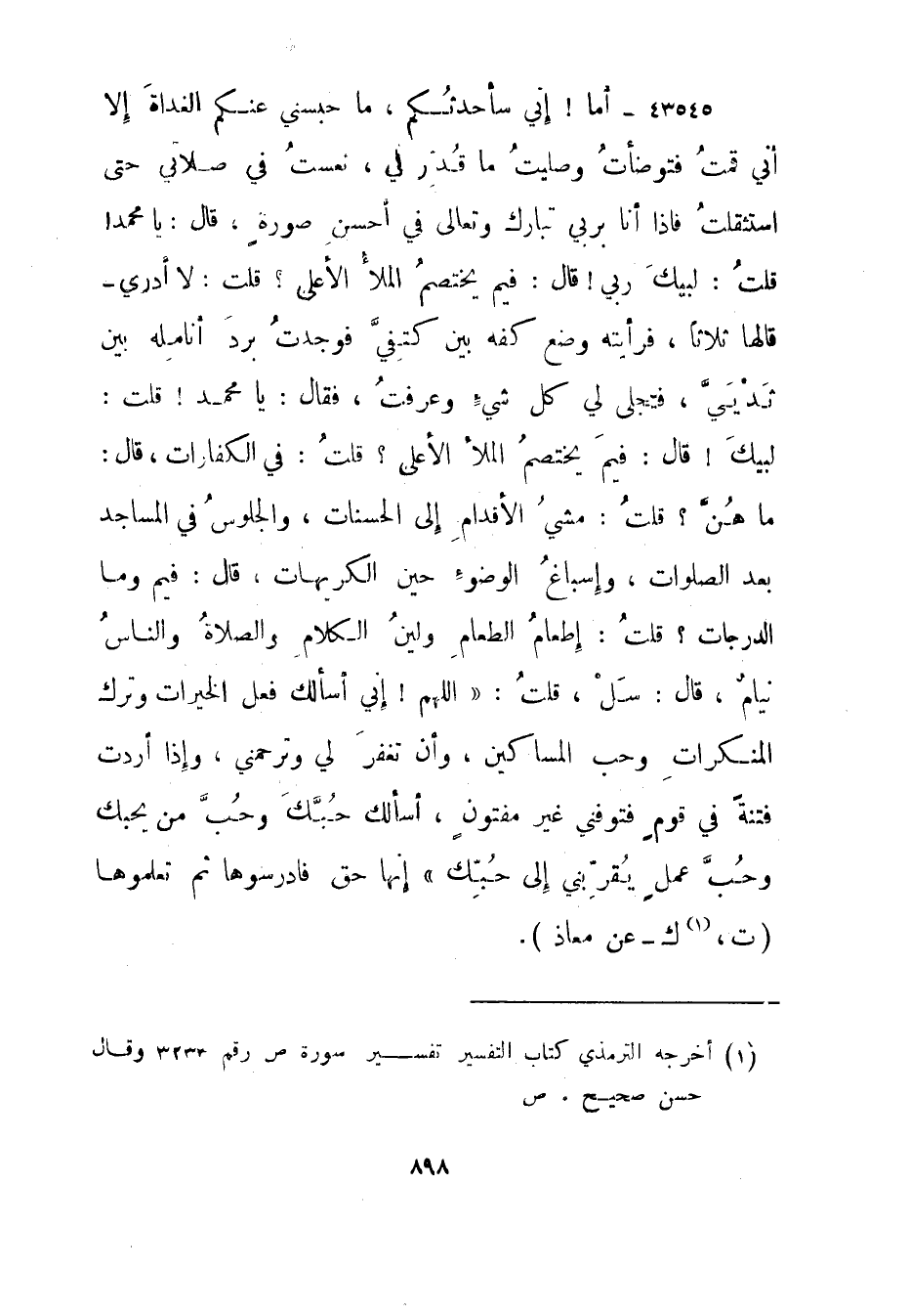 43545- أما! إني سأحدثكم، ما حبسني عنكم الغداة إلا أني قمت فتوضأت وصليت ما قدر لي، نعست في صلاتي حتى استثقلت فإذا أنا بربي تبارك وتعالى في أحسن صورة، قال: يا محمد! قلت: لبيك ربي! قال: فيم يختصم الملأ الأعلى؟ قلت: لا أدري - قالها ثلاثا، فرأيته وضع كفه بين كتفي فوجدت برد أنامله بين ثديي، فتجلى لي كل شيء وعرفت، فقال: يا محمد! قلت: لبيك! قال: فيم يختصم الملأ الأعلى؟ قلت: في الكفارات، قال: ما هن؟ قلت: مشي الأقدام إلى الحسنات، والجلوس في المساجد بعد الصلوات، وإسباغ الوضوء حين الكريهات، قال: فيم وما الدرجات؟ قلت: إطعام الطعام ولين الكلام والصلاة والناس نيام، قال: سل، قلت: "اللهم! إني أسألك فعل الخيرات وترك المنكرات وحب المساكين، وأن تغفر لي وترحمني، وإذا أردت فتنة في قوم فتوفني غير مفتون، أسألك حبك وحب من يحبك وحب عمل يقربني إلى حبك" إنها حق فادرسوها ثم تعلموها."ت، "1 ك - عن معاذ".