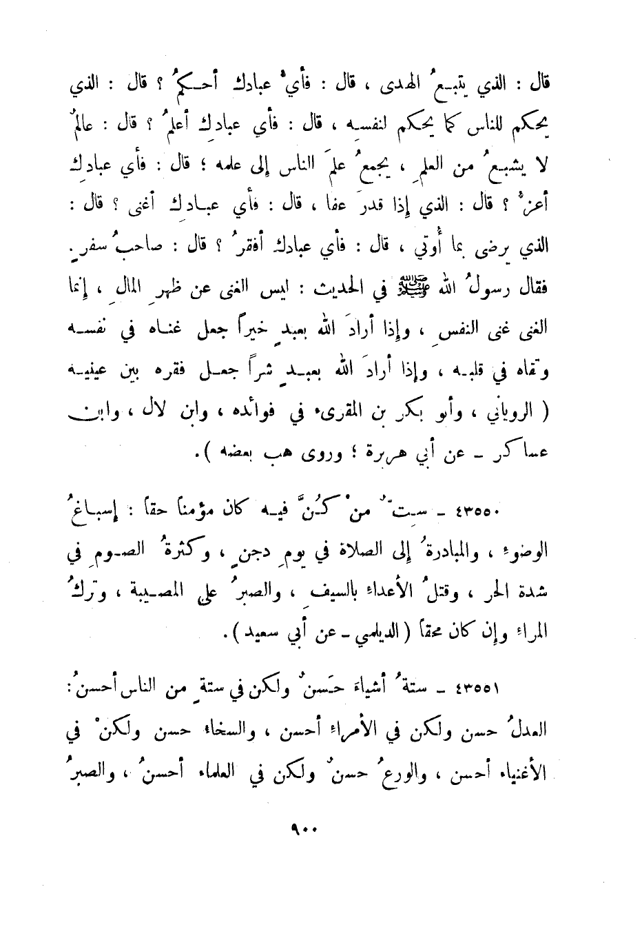 قال: الذي يتبع الهدى، قال: فأي عبادك أحكم؟ قال: الذي يحكم للناس كما يحكم لنفسه، قال: فأي عبادك أعلم؟ قال: عالم لا يشبع من العلم، يجمع علم الناس إلى علمه؛ قال: فأي عبادك أعز؟ قال: الذي إذا قدر عفا، قال: فأي عبادك أغنى؟ قال: الذي يرضى بما أوتي، قال: فأي عبادك أفقر؟ قال: صاحب سفر، فقال رسول الله صلى الله عليه وسلم في الحديث: ليس الغنى عن ظهر المال، إنما الغنى غنى النفس، وإذا أراد الله بعبد خيرا جعل غناه في نفسه وتقاه في قلبه، وإذا أراد الله بعبد شرا جعل فقره بين عينيه."الروياني، وأبو بكر بن المقرئ في فوائده، وابن لال، وابن عساكر - عن أبي هريرة؛ وروى هب بعضه".