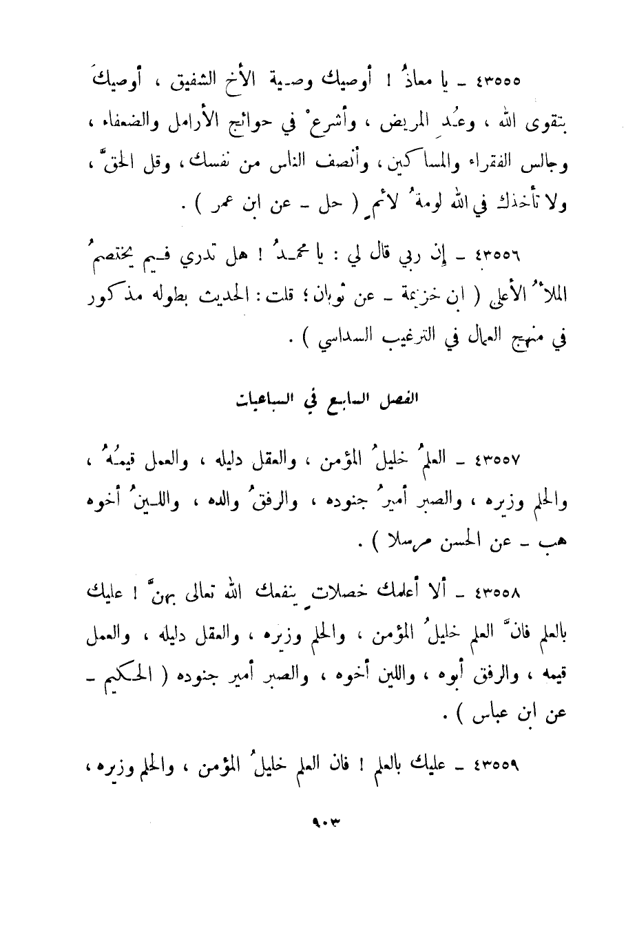 43558- ألا أعلمك خصلات ينفعك الله تعالى بهن! عليك بالعلم فإن العلم خليل المؤمن، والحلم وزيره، والعقل دليله، والعمل قيمه، والرفق أبوه، واللين أخوه، والصبر أمير جنوده."الحكيم - عن ابن عباس".