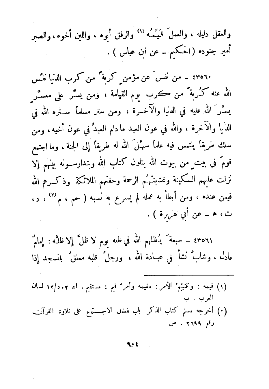 43560- من نفس عن مؤمن كربة من كرب الدنيا نفس الله عنه كربة من كرب يوم القيامة، ومن يسر على معسر يسر الله عليه في الدنيا والآخرة، ومن ستر مسلما ستره الله في الدنيا والآخرة، والله في عون العبد ما دام العبد في عون أخيه، ومن سلك طريقا يلتمس فيه علما سهل الله له طريقا إلى الجنة، وما اجتمع قوم في بيت من بيوت الله يتلون كتاب الله ويتدارسونه بينهم إلا نزلت عليهم السكينة وغشيتهم الرحمة وحفتهم الملائكة وذكرهم الله فيمن عنده، ومن أبطأ به عمله لم يسرع به نسبه."حم، م "2 د، ت، هـ - عن أبي هريرة".