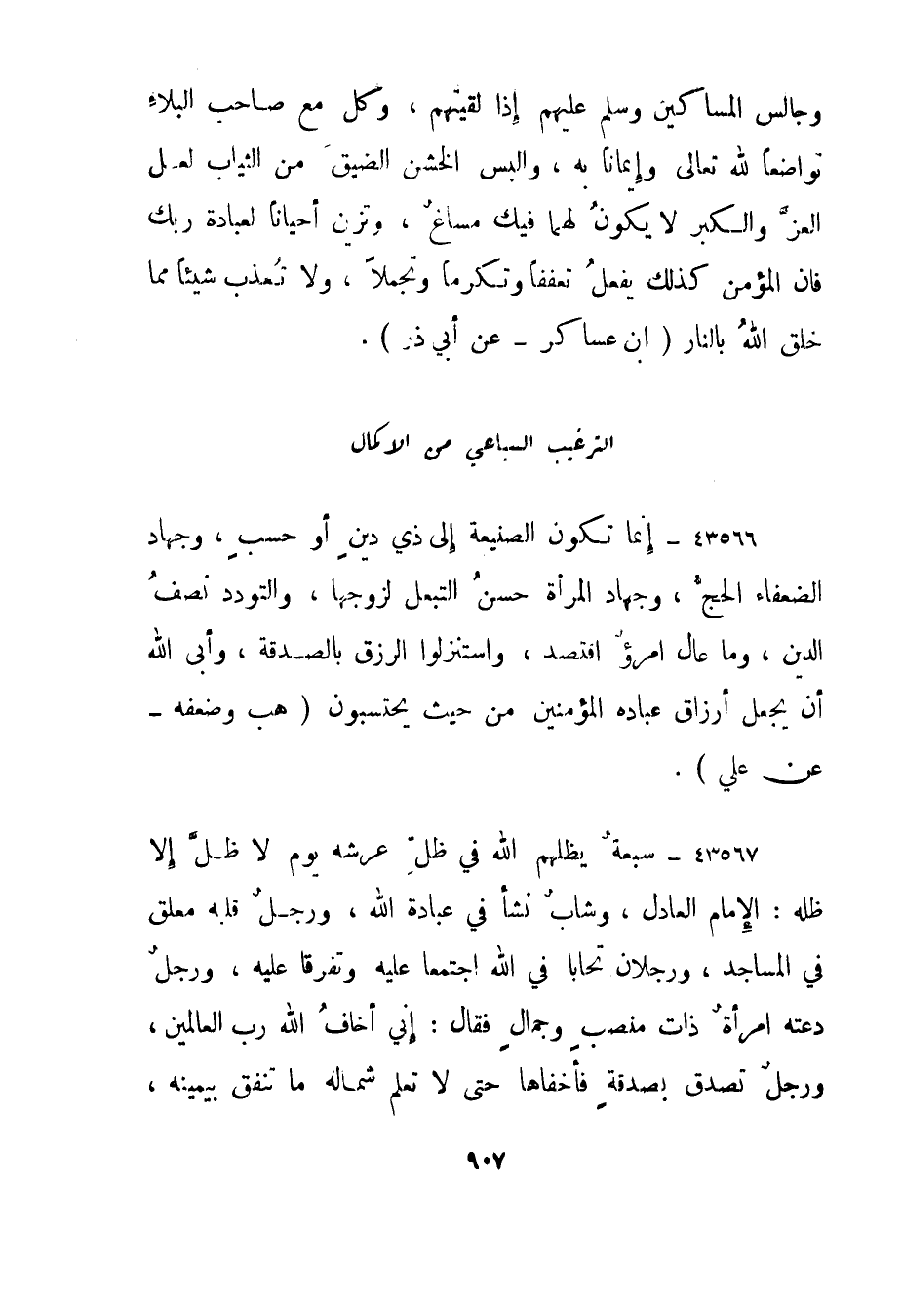 43567- سبعة يظلهم الله في ظل عرشه يوم لا ظل إلا ظله: الإمام العادل، وشاب نشأ في عبادة الله، ورجل قلبه معلق في المساجد، ورجلان تحابا في الله اجتمعا عليه وتفرقا عليه، ورجل دعته امرأة ذات منصب وجمال فقال: إني أخاف الله رب العالمين، ورجل تصدق بصدقة فأخفاها حتى لا تعلم شماله ما تنفق بيمينه،