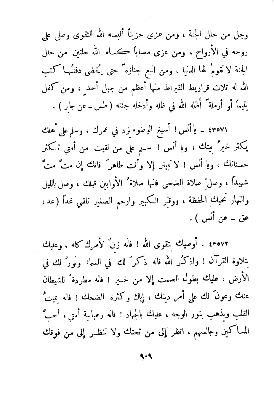 43571- يا أنس! أسبغ الوضوء يزد في عمرك، وسلم على أهلك يكثر خير بيتك، ويا أنس! سلم على من لقيت من أمتي تكثر حسناتك، ويا أنس! لا تبيتن إلا وأنت طاهر فإنك إن مت مت شهيدا، وصل صلاة الضحى فإنها صلاة الأوابين قبلك، وصل بالليل والنهار تحبك الحفظة، ووقر الكبير وارحم الصغير تلقني غدا."عد، عق - عن أنس".