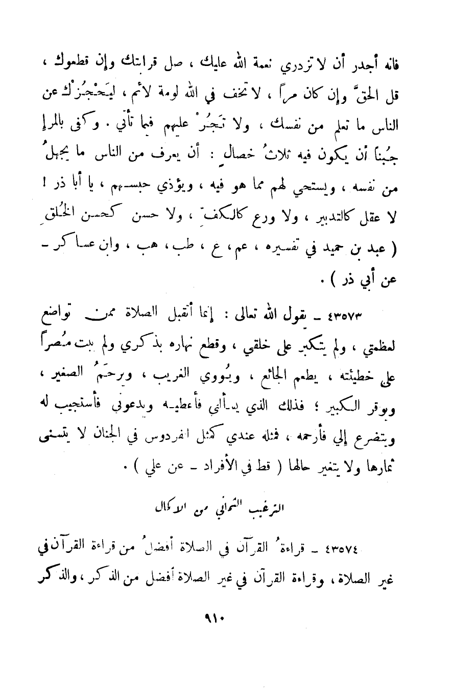 43574- قراءة القرآن في الصلاة أفضل من قراءة القرآن في غير الصلاة، وقراءة القرآن في غير الصلاة أفضل من الذكر، والذكر
