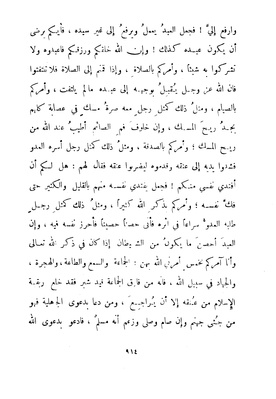 وارفع إلي! فجعل العبد يعمل ويرفع إلى غير سيده، فأيكم يرضى أن يكون عبده كذلك! وإن الله خلقكم ورزقكم فاعبدوه ولا تشركوا به شيئا، وأمركم بالصلاة، وإذا قمتم إلى الصلاة فلا تلتفتوا فإن الله عز وجل يقبل بوجهه إلى عبده مالم يلتفت، وأمركم بالصيام، ومثل ذلك كمثل رجل معه صرة مسك في عصابة كلهم يجد ريح المسك، وإن خلوف فم الصائم أطيب عند الله من ريح المسك؛ وأمركم بالصدقة، ومثل ذلك كمثل رجل أسره العدو فشدوا يديه إلى عنقه وقدموه ليضربوا عنقه فقال لهم: هل لكم أن أفتدي نفسي منكم! فجعل يفتدي نفسه منهم بالقليل والكثير حتى فك نفسه؛ وأمركم بذكر الله كثيرا، ومثل ذلك كمثل رجل طلبه العدو سراعا في أثره فأتى حصنا حصينا فأحرز نفسه فيه، وإن العبد أحصن ما يكون من الشيطان إذا كان في ذكر الله تعالى وأنا آمركم بخمس أمرني الله بهن: الجماعة والسمع والطاعة، والهجرة، والجهاد في سبيل الله، فإنه من فارق الجماعة قيد شبر فقد خلع ربقة الإسلام من عنقه إلا أن يراجع، ومن دعا بدعوى الجاهلية فهو من جثى جهنم وإن صام وصلى وزعم أنه مسلم، فادعو بدعوى الله