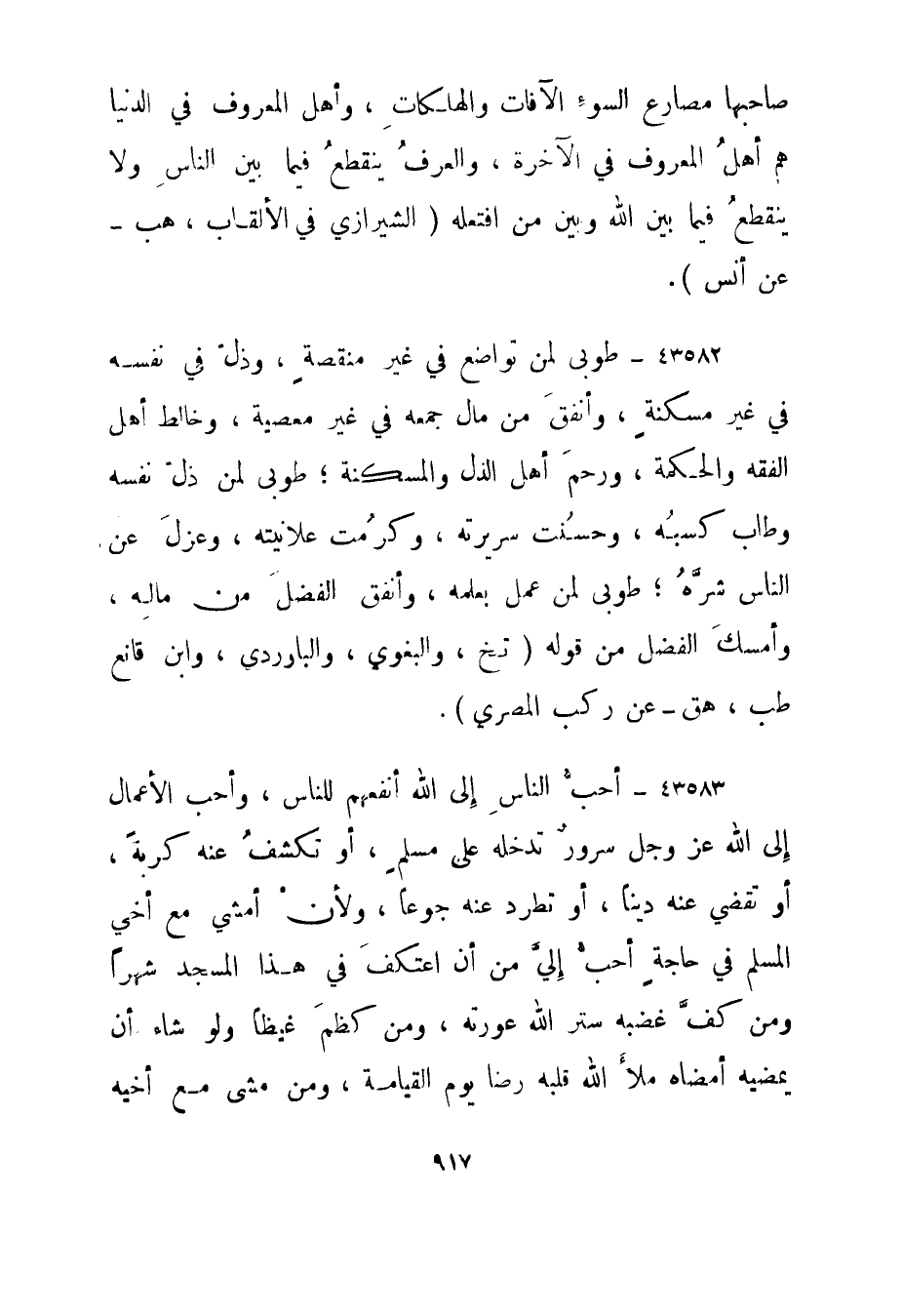 43582- طوبى لمن تواضع في غير منقصة، وذل في نفسه في غير مسكنة، وأنفق من مال جمعه في غير معصية، وخالط أهل الفقه والحكمة، ورحم أهل الذل والمسكنة؛ طوبى لمن ذل نفسه وطاب كسبه، وحسنت سريرته، وكرمت علانيته، وعزل عن الناس شره؛ طوبى لمن عمل بعلمه، وأنفق الفضل من ماله، وأمسك الفضل من قوله."تخ، والبغوي، والباوردي، وابن قانع طب، هق - عن ركب المصري".