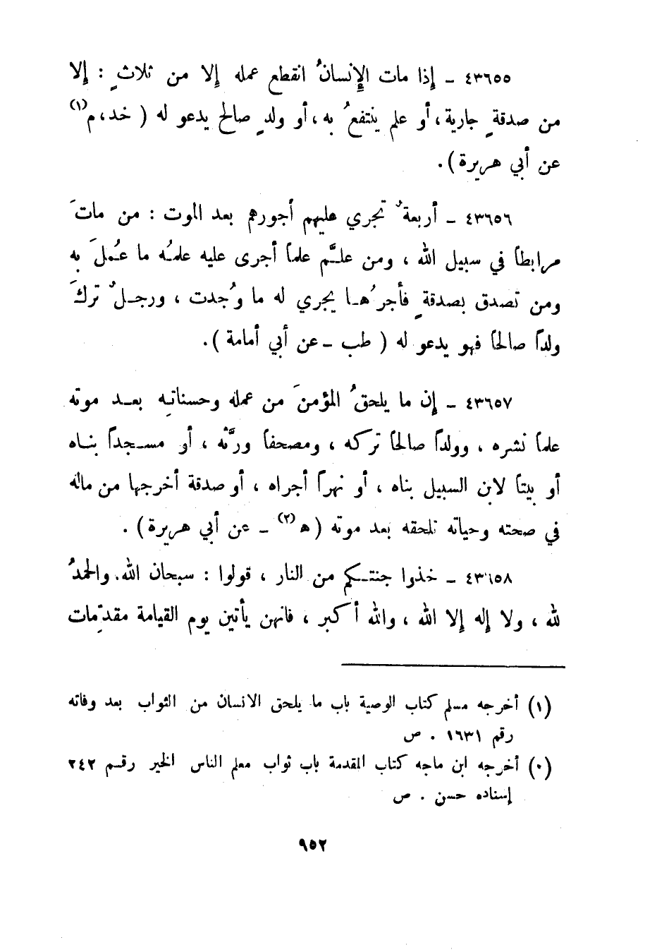 43655- إذا مات الإنسان انقطع عمله إلا من ثلاث: إلا من صدقة جارية، أو علم ينتفع به، أو ولد صالح يدعو له." خد، م "1 عن أبي هريرة".