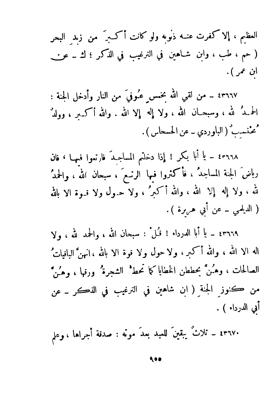 العظيم، إلا كفرت عنه ذنوبه ولو كانت أكبر من زبد البحر."حم، طب، وابن شاهين في الترغيب في الذكر؛ ك - عن ابن عمر".