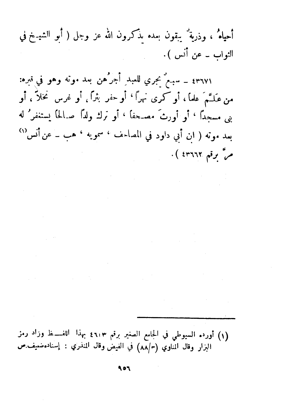 43671- سبع يجري للعبد أجرهن بعد موته وهو في قبره: من علم علما، أو كرى نهرا، أو حفر بئرا، أو غرس نخلا، أو بنى مسجدا، أو أورث مصحفا، أو ترك ولدا صالحا يستغفر له بعد موته. "ابن أبي داود في المصاحف، سمويه، هب - عن أنس "1 مر برقم 43662".