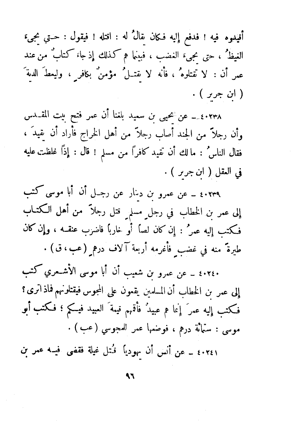40238- عن يحيى بن سعيد بلغنا أن عمر فتح بيت المقدس وأن رجلا من الجند أصاب رجلا من أهل الخراج فأراد أن يقيد، فقال الناس: ما لك أن تقيد كافرا من مسلم! قال: إذا غلظت عليه في العقل."ابن جرير".