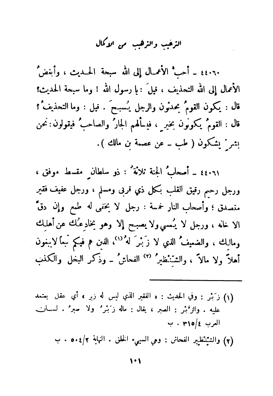 44060- أحب الأعمال إلى الله سبحة الحديث، وأبغض الأعمال إلى الله التحذيف، قيل: يا رسول الله! وما سبحة الحديث؟ قال: يكون القوم يحدثون والرجل يسبح. قيل: وما التحذيف؟ قال: القوم يكونون بخير، فيسألهم الجار والصاحب فيقولون: نحن بشر يشكون. "طب - عن عصمة بن مالك".
