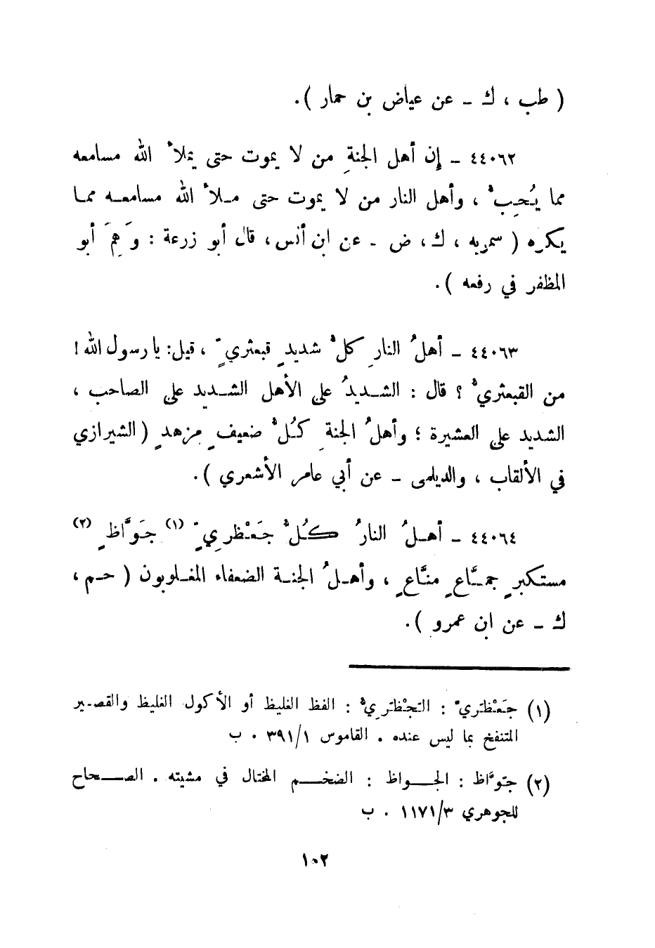44064- أهل النار كل جعظري 1 جواظ 2 مستكبر جماع مناع، وأهل الجنة الضعفاء المغلوبون. "حم، ك - عن ابن عمرو".
