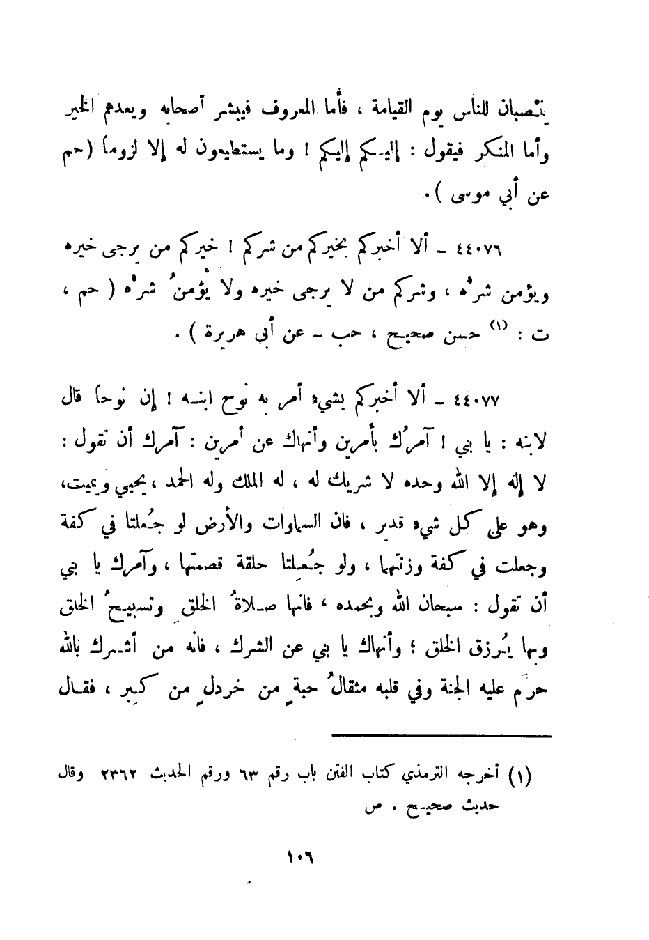 44077- ألا أخبركم بشيء أمر به نوح ابنه! إن نوحا قال لابنه: يا بني! آمرك بأمرين وأنهاك عن أمرين: آمرك أن تقول: لا إله إلا الله وحده لا شريك له، له الملك وله الحمد، يحيي ويميت، وهو على كل شيء قدير، فإن السماوات والأرض لو جعلتا في كفة وجعلت في كفة وزنتهما، ولو جعلتا حلقة قصمتها، وآمرك يا بني أن تقول: سبحان الله وبحمده، فإنها صلاة الخلق وتسبيح الخلق وبها يرزق الخلق؛ وأنهاك يا بني عن الشرك، فإنه من أشرك بالله حرم عليه الجنة وفي قلبه مثقال حبة من خردل من كبر، فقال