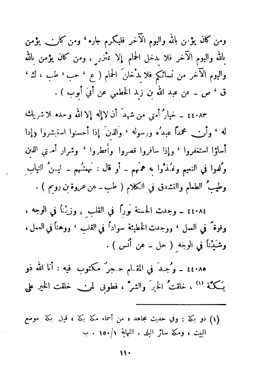 44085- وجد في المقام حجر مكتوب فيه: أنا الله ذو بكة 1، خلقت الخير والشر، فطوبى لمن خلقت الخير على