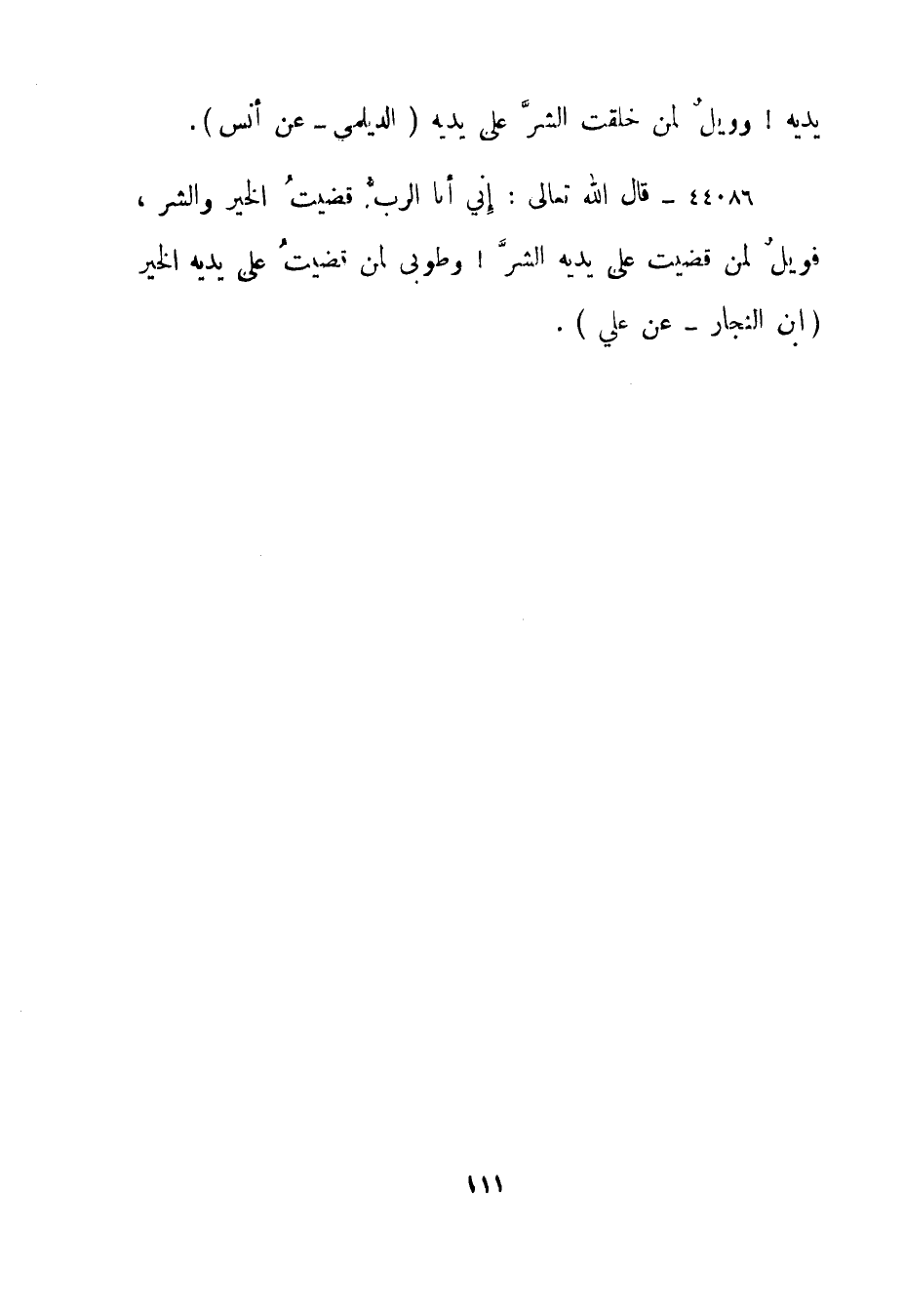 44086- قال الله تعالى: إني أنا الرب، قضيت الخير والشر، فويل لمن قضيت على يديه الشر! وطوبى لمن قضيت على يديه الخير. "ابن النجار - عن علي".