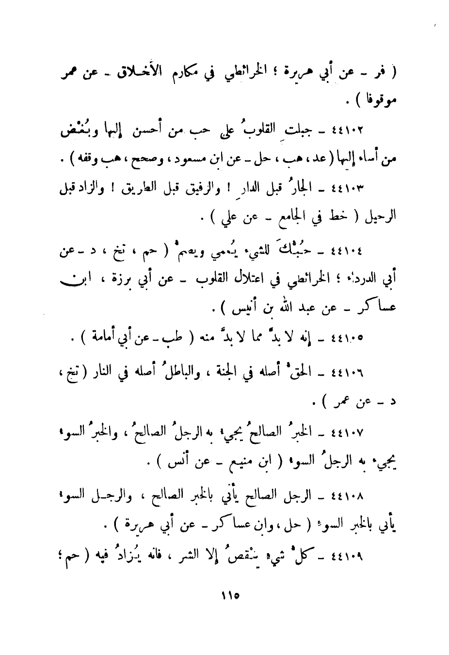"فر - عن أبي هريرة؛ الخرائطي في مكارم الأخلاق - عن عمر موقوفا".