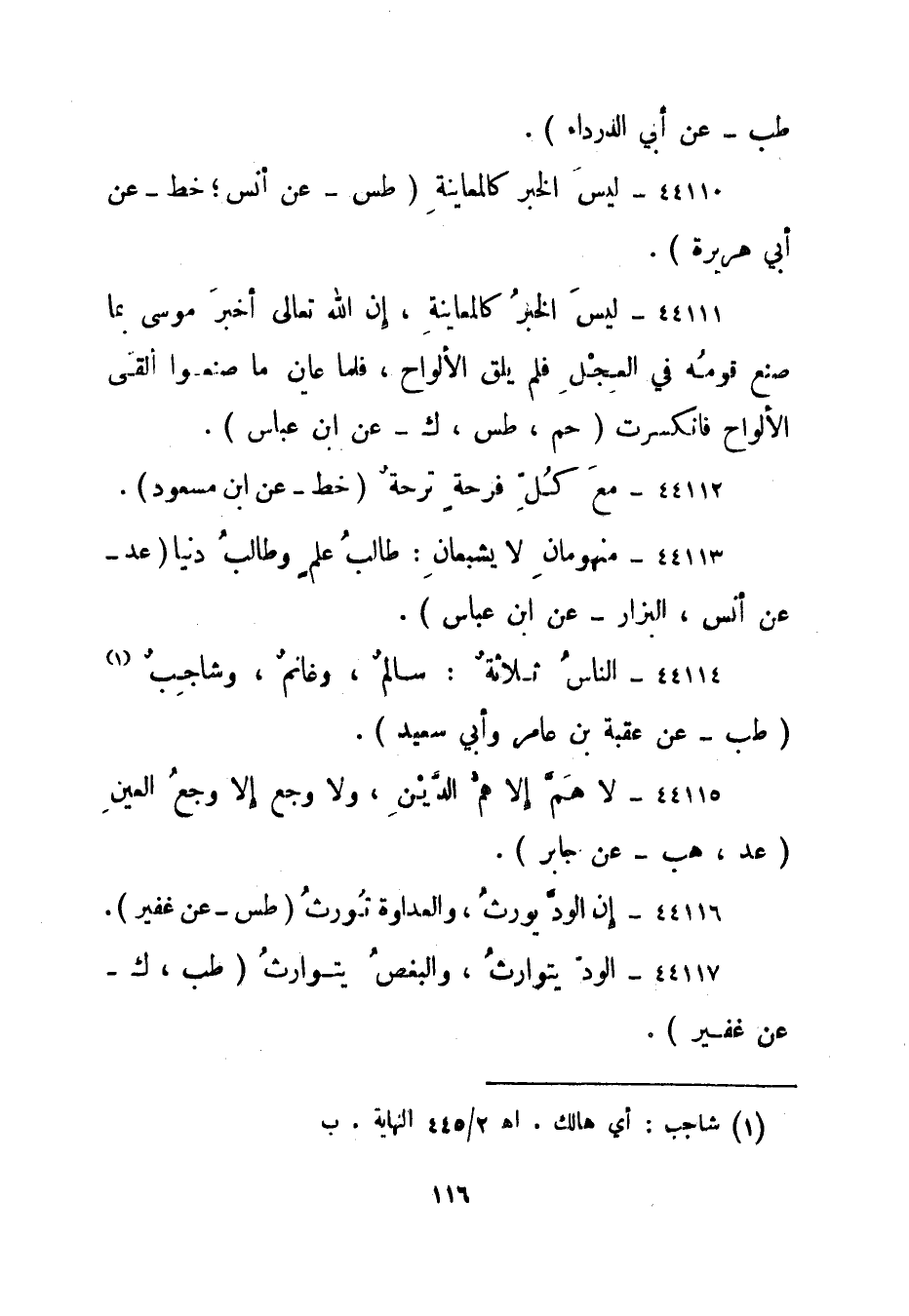 44113- منهومان لا يشبعان: طالب علم وطالب دنيا. "عد - عن أنس، البزار - عن ابن عباس".