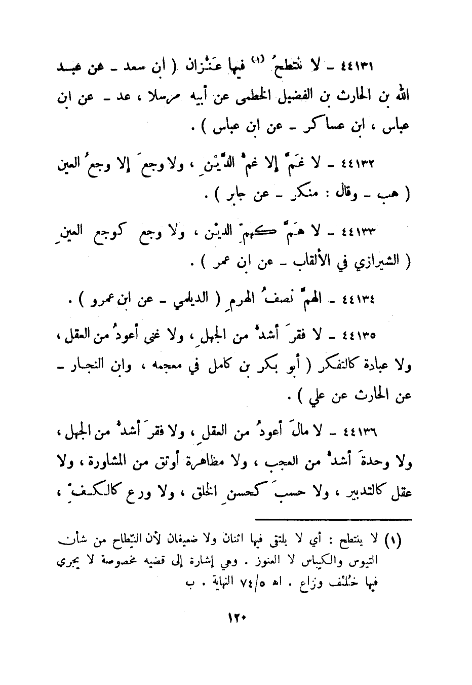 44135- لا فقر أشد من الجهل، ولا غنى أعود من العقل، ولا عبادة كالتفكر. "أبو بكر بن كامل في معجمه، وابن النجار - عن الحارث عن علي".
