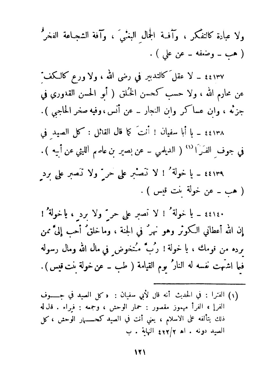 44138- يا أبا سفيان! أنت كما قال القائل: كل الصيد في جوف الفرا1. "الديلمي - عن بصير بن عاصم الليثي عن أبيه".