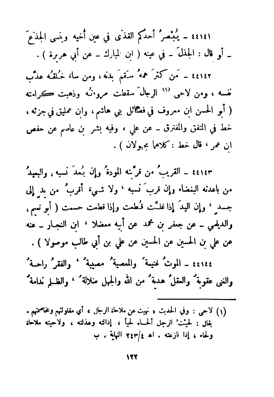 44142- من كثر همه سقم بدنه، ومن ساء خلقه عذب نفسه، ومن لاحى 1 الرجال سقطت مروءته وذهبت كرامته. "أبو الحسن ابن معروف في فضائل بني هاشم، وابن عمليق في جزئه، خط في المتفق والمفترق - عن علي، وفيه بشر بن عاصم عن حفص ابن عمر، قال خط: كلاهما مجهولان".