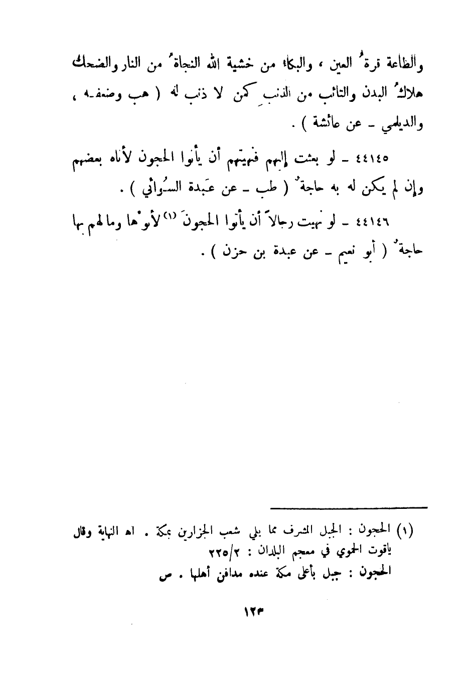 44146- لو نهيت رجالا أن يأتوا الحجون 1 لأتوها وما لهم بها حاجة. "أبو نعيم - عن عبدة بن حزن".