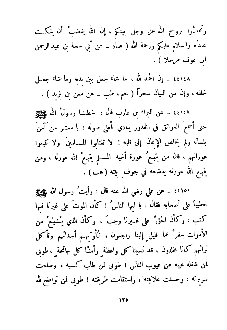 44150- عن علي رضي الله عنه قال: رأيت رسول الله صلى الله عليه وسلم خطيبا على أصحابه فقال: يا أيها الناس! كأن الموت على غيرنا فيها كتب، وكأن الحق على غيرنا وجب، وكأن الذي يشيع من الأموات سفر عما قليل إلينا راجعون، نأويهم أجداثهم وتأكل تراثهم كانا مخلدون، قد نسينا كل واعظة وأمنا كل جائحة، طوبى لمن شغله عيبه عن عيوب الناس! طوبى لمن طاب كسبه، وصلحت سريرته، وحسنت علانيته، واستقامت طريقته! طوبى لمن تواضع لله
