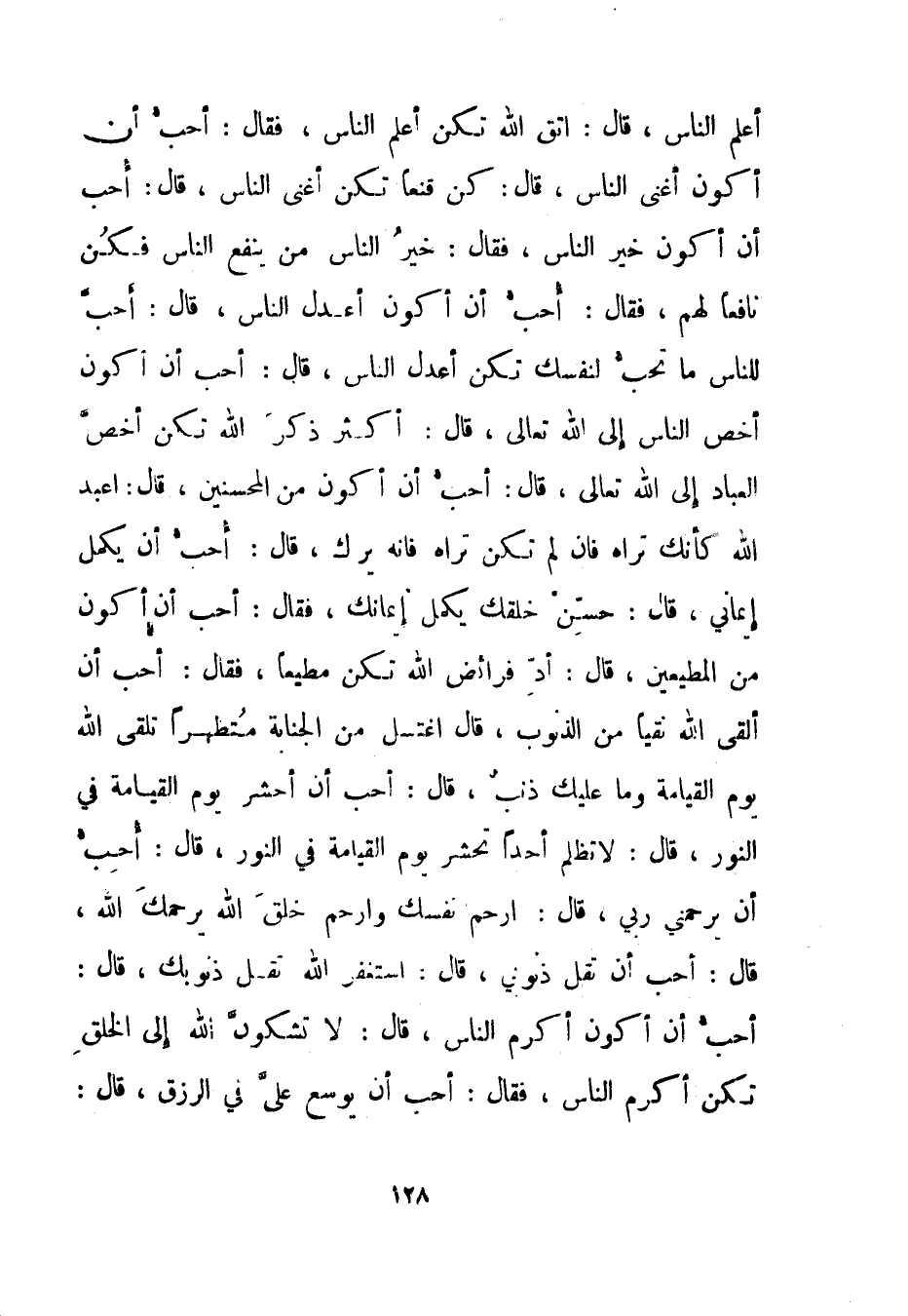 أعلم الناس، قال: اتق الله تكن أعلم الناس، فقال: أحب أن أكون أغنى الناس، قال: كن قنعا تكن أغنى الناس، قال: أحب أن أكون خير الناس، فقال: خير الناس من ينفع الناس فكن نافعا لهم، فقال: أحب أن أكون أعدل الناس، قال: أحب للناس ما تحب لنفسك تكن أعدل الناس، قال: أحب أن أكون أخص الناس إلى الله تعالى، قال: أكثر ذكر الله تكن أخص العباد إلى الله تعالى، قال: أحب أن أكون من المحسنين، قال: اعبد الله كأنك تراه فإن لم تكن تراه فإنه يراك، قال: أحب أن يكمل إيماني، قال: حسن خلقك يكمل إيمانك، فقال: أحب أن أكون من المطيعين، قال: أد فرائض الله تكن مطيعا، فقال: أحب أن ألقى الله نقيا من الذنوب، قال اغتسل من الجنابة متطهرا تلقى الله يوم القيامة وما عليك ذنب، قال: أحب أن أحشر يوم القيامة في النور، قال: لا تظلم أحدا تحشر يوم القيامة في النور، قال: أحب أن يرحمني ربي، قال: ارحم نفسك وارحم خلق الله يرحمك الله، قال: أحب أن تقل ذنوبي، قال: استغفر الله تقل ذنوبك، قال: أحب أن أكون أكرم الناس، قال: لا تشكون الله إلى الخلق تكن أكرم الناس، فقال: أحب أن يوسع علي في الرزق، قال: