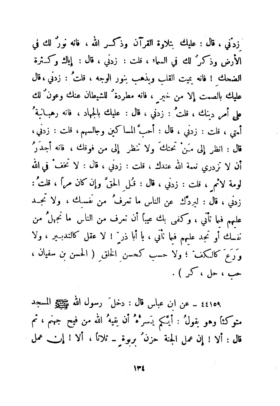 44159- عن ابن عباس قال: دخل رسول الله صلى الله عليه وسلم المسجد متوكئا وهو يقول: أيكم يسره أن يقيه الله من فيح جهنم، ثم قال: ألا! إن عمل الجنة حزن بربوة - ثلاثا، ألا - إن عمل