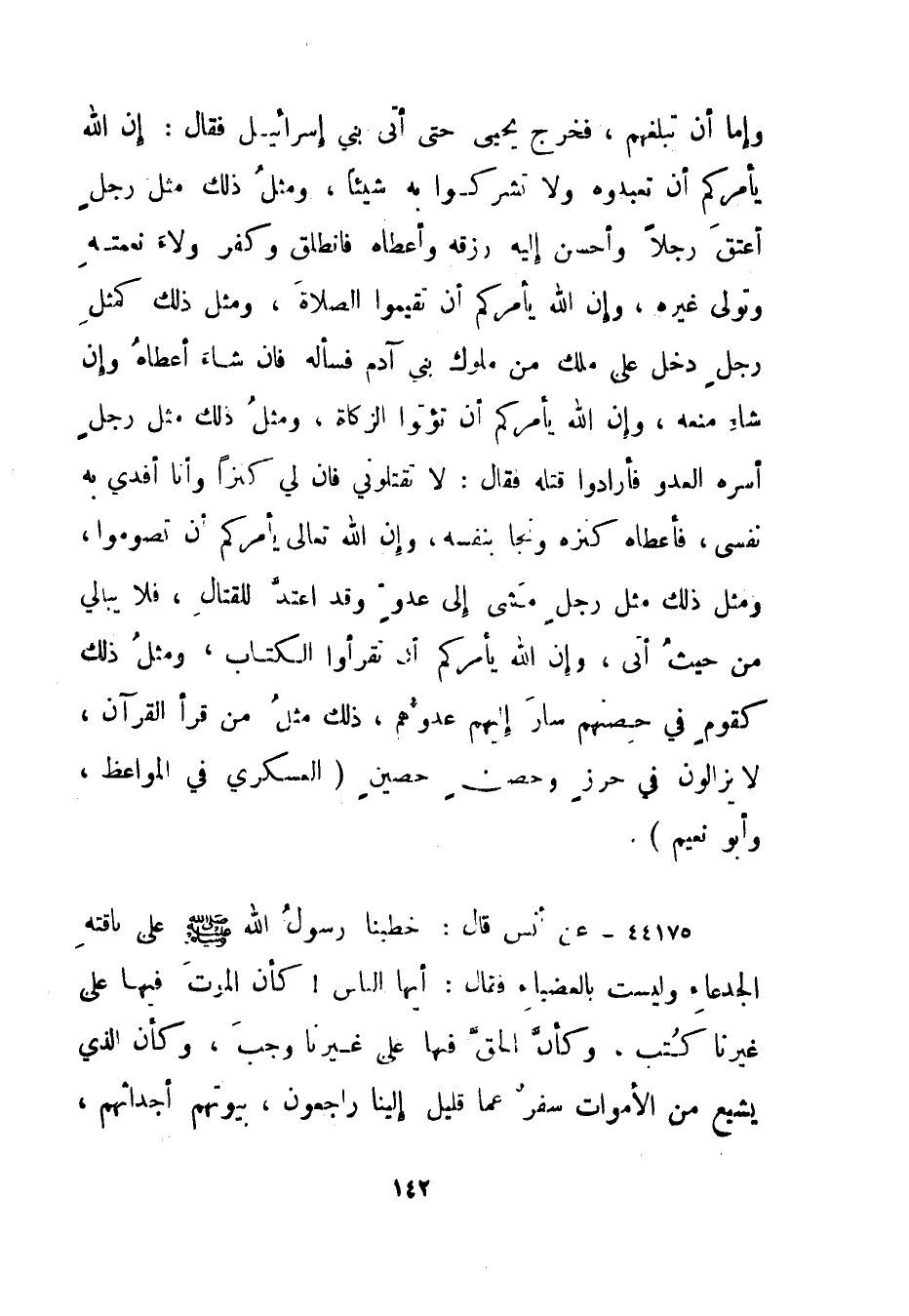44175- عن أنس قال: خطبنا رسول الله صلى الله عليه وسلم على ناقته الجدعاء وليست بالعضباء فقال: أيها الناس! كأن الموت فيها على غيرنا كتب، وكأن الحق فيها على غيرنا وجب، وكأن الذي يشيع من الأموات سفر عما قليل إلينا راجعون، بيوتهم أجداثهم،