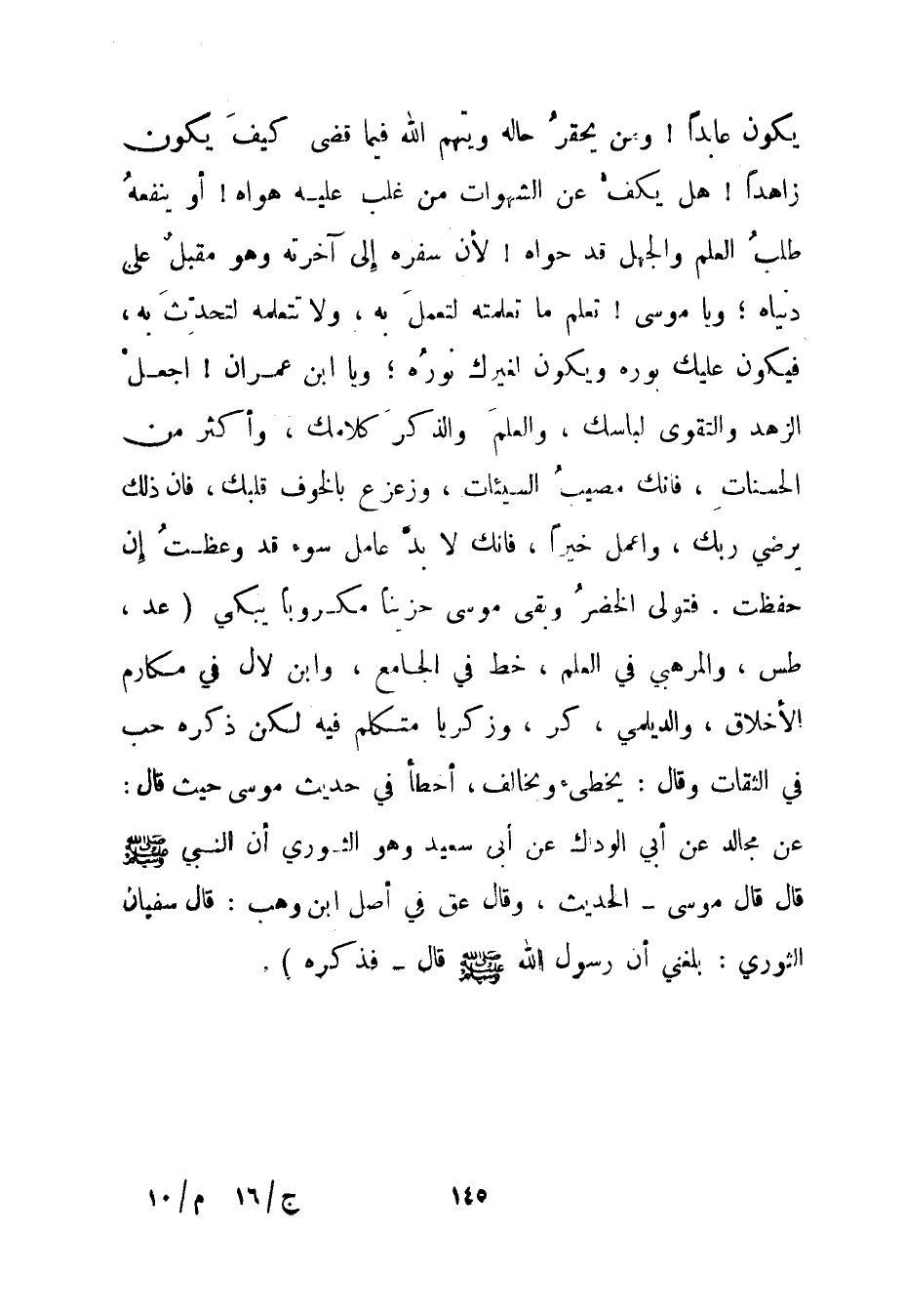 يكون عابدا! ومن يحقر حاله ويتهم الله فيما قضى كيف يكون زاهدا! هل يكف عن الشهوات من غلب عليه هواه! أو ينفعه طلب العلم والجهل قد حواه! لأن سفره إلى آخرته وهو مقبل على دنياه؛ ويا موسى! تعلم ما تعلمته لتعمل به، ولا تتعلمه لتحدث به، فيكون عليك بوره ويكون لغيرك نوره؛ ويا ابن عمران! اجعل الزهد والتقوى لباسك، والعلم والذكر كلامك، وأكثر من الحسنات، فإنك مصيب السيئات، وزعزع بالخوف قلبك، فإن ذلك يرضي ربك، واعمل خيرا، فإنك لا بد عامل سوء قد وعظت إن حفظت. فتولى الخضر وبقى موسى حزينا مكروبا يبكي. "عد، طس، والمرهبي في العلم، خط في الجامع، وابن لال في مكارم الأخلاق، والديلمي، كر، وزكريا متكلم فيه لكن ذكره حب في الثقات وقال: يخطئ ويخالف، أخطأ في حديث موسى حيث قال: عن مجالد عن أبي الوداك عن أبي سعيد وهو الثوري أن النبي صلى الله عليه وسلم قال قال موسى - الحديث، وقال عق في أصل ابن وهب: قال سفيان الثوري: بلغني أن رسول الله صلى الله عليه وسلم قال - فذكره ".