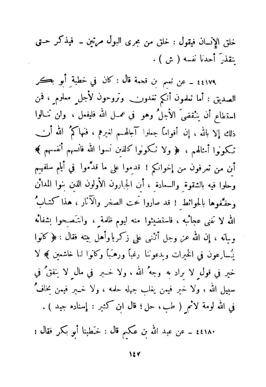 44179- عن نعيم بن قحمة قال: كان في خطبة أبو بكر الصديق: أما تعلمون أنكم تغدون وتروحون لأجل معلوم، فمن استطاع أن ينقضى الأجل وهو في عمل الله فليفعل، ولن تنالوا ذلك إلا بالله، إن أقواما جعلوا آجالهم لغيرهم، فنهاكم الله أن تكونوا أمثالهم، {وَلا تَكُونُوا كَالَّذِينَ نَسُوا اللَّهَ فَأَنْسَاهُمْ أَنْفُسَهُمْ} أين من تعرفون من إخوانكم! قدموا على ما قدموا في أيام سلفهم وحلوا فيه بالشقوة والسعادة، أين الجبارون الأولون الذين بنوا المدائن وحففوها بالحوائط! قد صاروا تحت الصخر والآثار، هذا كتاب الله لا تفنى عجائبه، فاستضيئوا منه ليوم ظلمة، وانتضحوا بشفائه وبيانه، إن الله عز وجل أثنى على زكريا وأهل بيته فقال: {كَانُوا يُسَارِعُونَ فِي الْخَيْرَاتِ وَيَدْعُونَنَا رَغَباً وَرَهَباً وَكَانُوا لَنَا خَاشِعِينَ} لا خير في قول لا يراد به وجه الله، ولا خير في مال لا ينفق في سبيل الله، ولا خير فيمن يغلب جهله حلمه، ولا خير فيمن يخاف في الله لومة لائم. "طب، حل؛ قال ابن كثير: إسناده جيد".