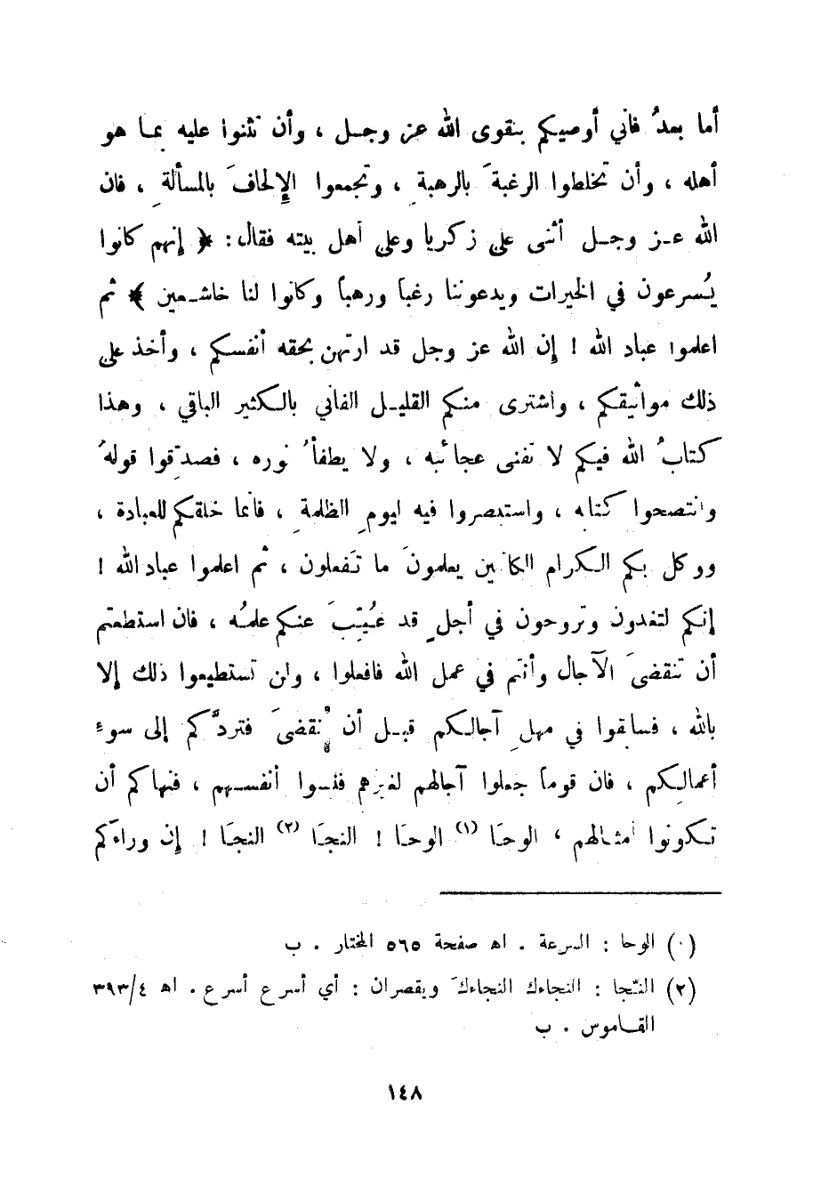 أما بعد فإني أوصيكم بتقوى الله عز وجل، وأن تثنوا عليه بما هو أهله، وأن تخلطوا الرغبة بالرهبة، وتجمعوا الإلحاف بالمسألة، فإن الله عز وجل أثنى على زكريا وعلى أهل بيته فقال: {إِنَّهُمْ كَانُوا يُسَارِعُونَ فِي الْخَيْرَاتِ وَيَدْعُونَنَا رَغَباً وَرَهَباً وَكَانُوا لَنَا خَاشِعِينَ} ثم اعلموا عباد الله! إن الله عز وجل قد ارتهن بحقه انفسكم، وأخذ على ذلك مواثيقكم، واشترى منكم القليل الفاني بالكثير الباقي، وهذا كتاب الله فيكم لا تفنى عجائبه، ولا يطفأ نوره، فصدقوا قوله وانتصحوا كتابه، واستبصروا فيه ليوم الظلمة، فإنما خلقكم للعبادة، ووكل بكم الكرام الكاتبين يعلمون ما تفعلون، ثم اعلموا عباد الله! إنكم لتغدون وتروحون في أجل قد غيب عنكم علمه، فإن استطعتم أن تنقضى الآجال وأنتم في عمل الله فافعلوا، ولن تستطيعوا ذلك إلا بالله، فسابقوا في مهل آجالكم قبل أن ينقضى فتردكم إلى سوء أعمالكم، فإن قوما جعلوا آجالهم لغيرهم فنسوا أنفسهم، فنهاكم أن تكونوا أمثالهم، الوحا 1 الوحا! النجا 2 النجا! إن وراءكم