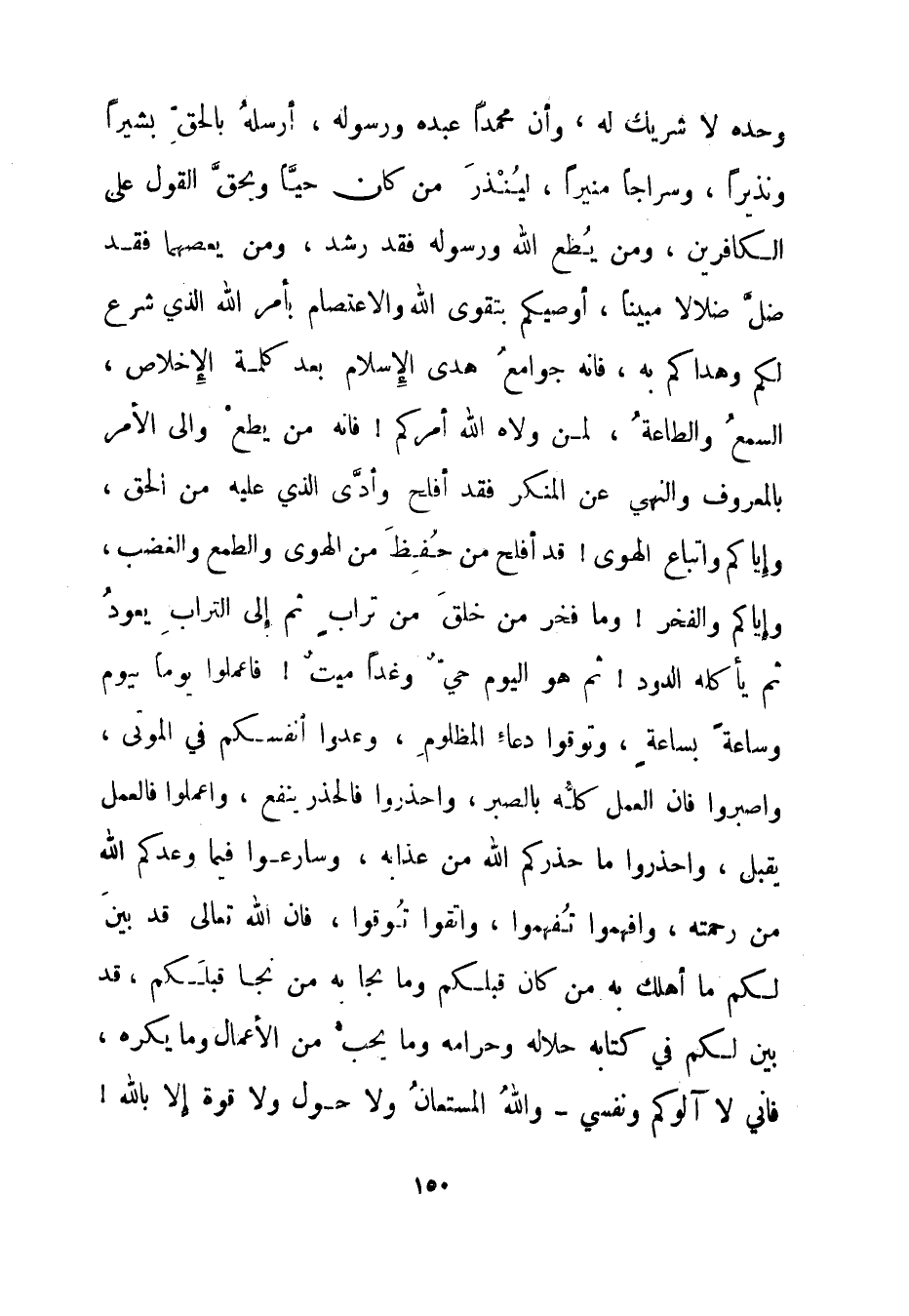 وحده لا شريك له، وأن محمدا عبده ورسوله، أرسله بالحق بشيرا ونذيرا، وسراجا منيرا، لينذر من كان حيا ويحق القول على الكافرين، ومن يطع الله ورسوله فقد رشد، ومن يعصهما فقد ضل ضلالا مبينا، أوصيكم بتقوى الله والاعتصام بأمر الله الذي شرع لكم وهداكم به، فإنه جوامع هدى الإسلام بعد كلمة الإخلاص، السمع والطاعة، لمن ولاه الله أمركم! فإنه من يطع والي الأمر بالمعروف والنهي عن المنكر فقد أفلح وأدى الذي عليه من الحق، وإياكم واتباع الهوى! قد أفلح من حفظ من الهوى والطمع والغضب، وإياكم والفخر! وما فخر من خلق من تراب ثم إلى التراب يعود ثم يأكله الدود! ثم هو اليوم حي وغدا ميت! فاعملوا يوما بيوم وساعة بساعة، وتوقوا دعاء المظلوم، وعدوا أنفسكم في الموتى، واصبروا فإن العمل كله بالصبر، واحذروا فالحذر ينفع، واعملوا فالعمل يقبل، واحذروا ما حذركم الله من عذابه، وسارعوا فيما وعدكم الله من رحمته، وافهموا تفهموا، واتقوا توقوا، فإن الله تعالى قد بين لكم ما أهلك به من كان قبلكم وما نجا به من نجا قبلكم، قد بين لكم في كتابه حلاله وحرامه وما يحب من الأعمال وما يكره، فإني لا آلوكم ونفسي - والله المستعان ولا حول ولا قوة إلا بالله!