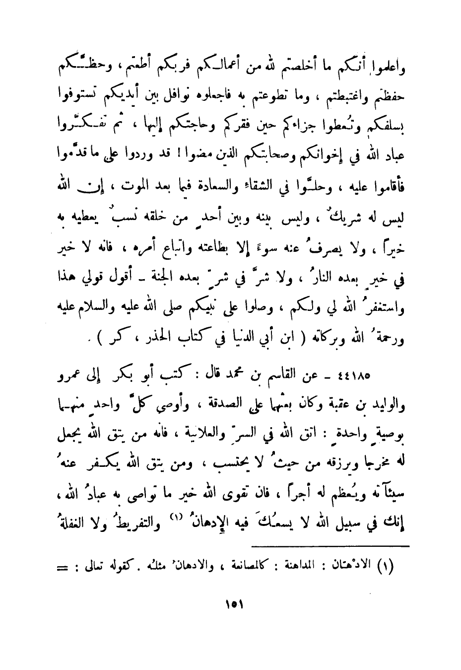 44185- عن القاسم بن محمد قال: كتب أبو بكر إلى عمرو والوليد بن عقبة وكان بعثهما على الصدقة، وأوصى كل واحد منهما بوصية واحدة: اتق الله في السر والعلانية، فإنه من يتق الله يجعل له مخرجا ويرزقه من حيث لا يحتسب، ومن يتق الله يكفر عنه سيئآته ويعظم له أجرا، فإن تقوى الله خير ما تواصى به عباد الله، إنك في سبيل الله لا يسعك فيه الإدهان 1 والتفريط ولا الغفلة