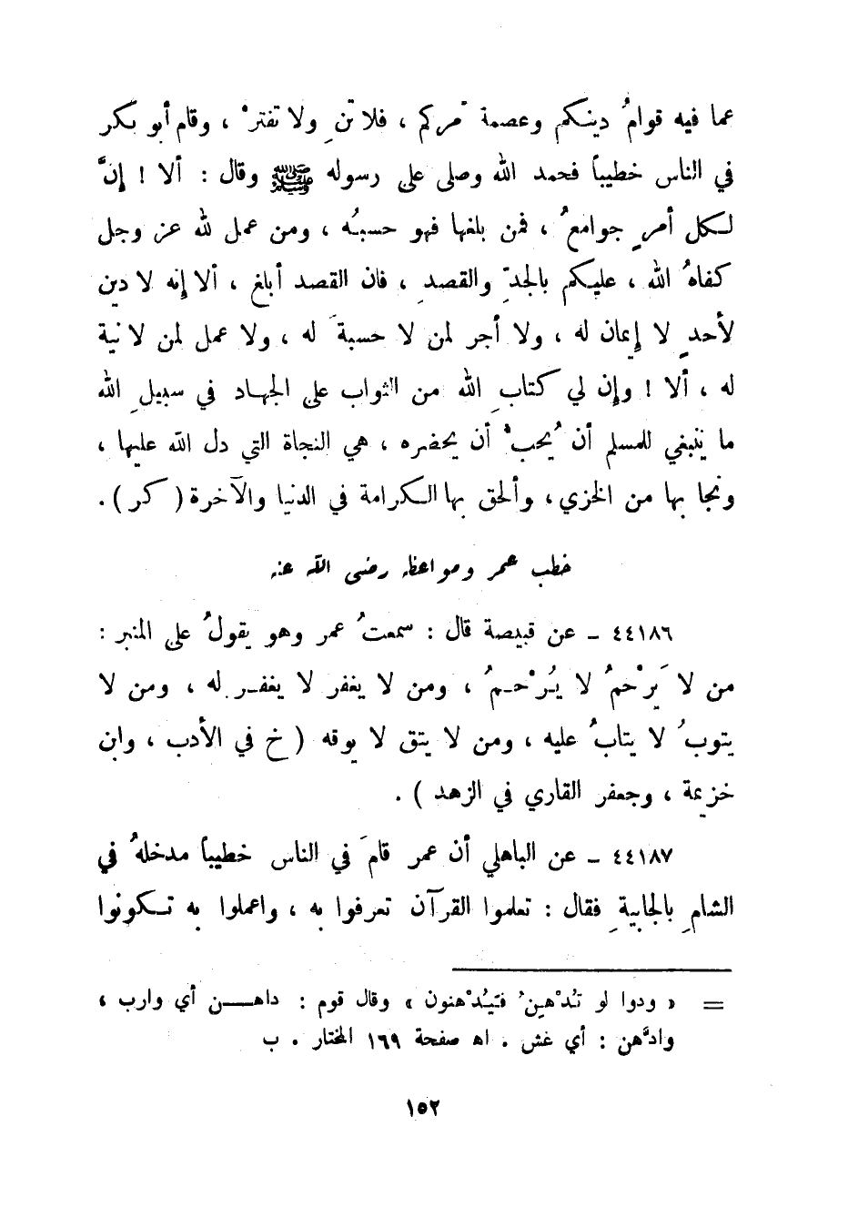 44187- عن الباهلي أن عمر قام في الناس خطيبا مدخله في الشام بالجابية فقال: تعلموا القرآن تعرفوا به، واعملوا به تكونوا