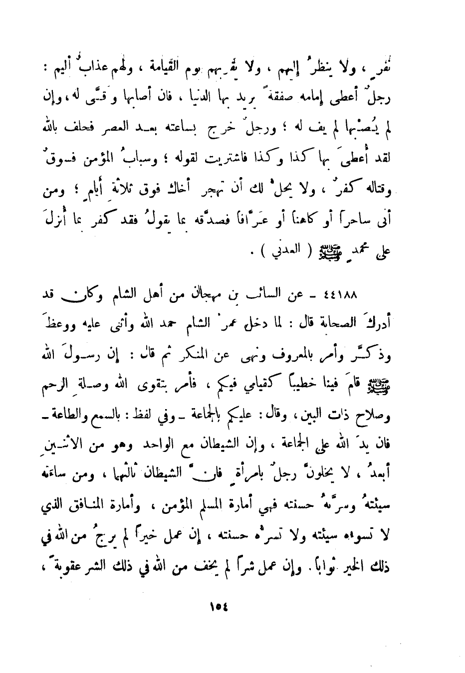 44188- عن السائب بن مهجان من أهل الشام وكان قد أدرك الصحابة قال: لما دخل عمر الشام حمد الله وأثنى عليه ووعظ وذكر وأمر بالمعروف ونهى عن المنكر ثم قال: إن رسول الله صلى الله عليه وسلم قام فينا خطيبا كقيامي فيكم، فأمر بتقوى الله وصلة الرحم وصلاح ذات البين، وقال: عليكم بالجماعة - وفي لفظ: بالسمع والطاعة - فإن يد الله على الجماعة، وإن الشيطان مع الواحد وهو من الاثنين أبعد، لا يخلون رجل بامرأة فإن الشيطان ثالثهما، ومن ساءته سيئته وسرته حسنته فهي أمارة المسلم المؤمن، وأمارة المنافق الذي لا تسوءه سيئته ولا تسره حسنته، إن عمل خيرا لم يرج من الله في ذلك الخير ثوابا، وإن عمل شرا لم يخف من الله في ذلك الشر عقوبة،