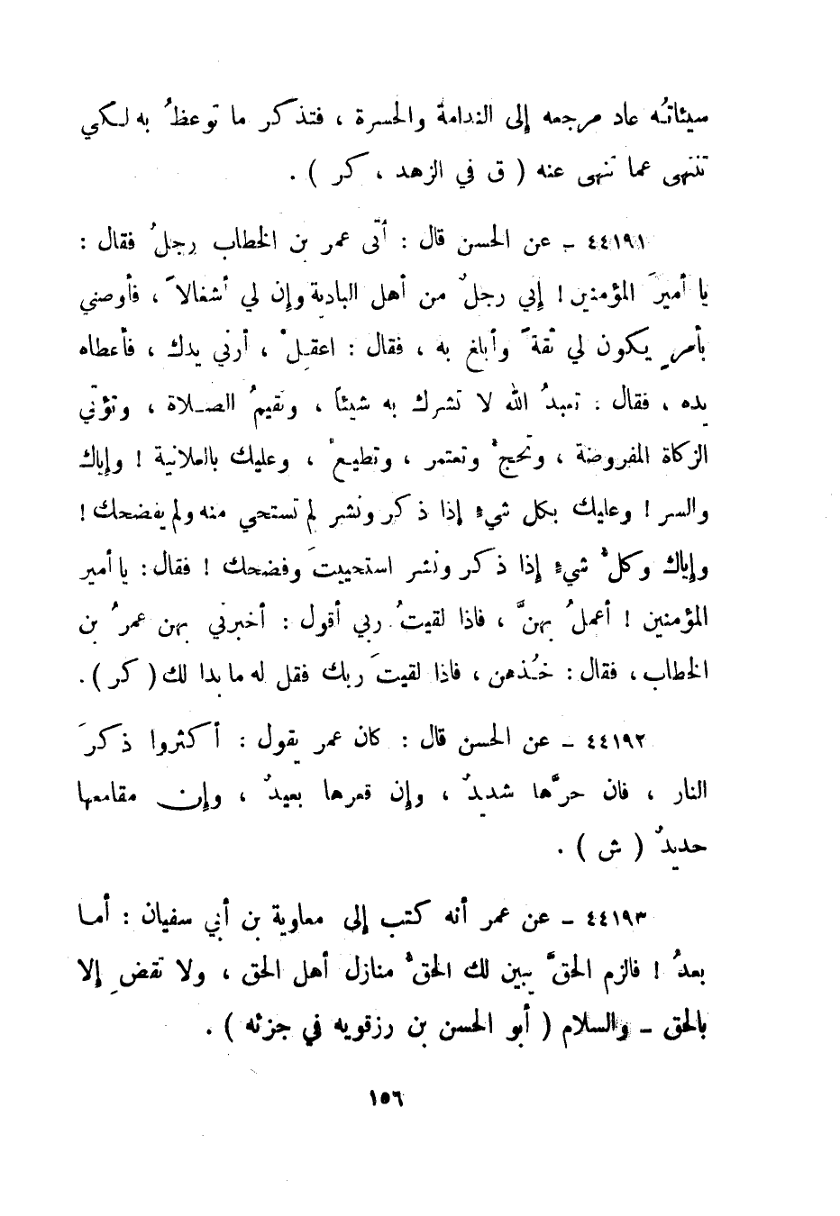 44191- عن الحسن قال: أتى عمر بن الخطاب رجل فقال: يا أمير المؤمنين! إني رجل من أهل البادية وإن لي أشغالا، فأوصني بأمر يكون لي ثقة وأبلغ به، فقال: اعقل، أرني يدك، فأعطاه يده، فقال: تعبد الله لا تشرك به شيئا، وتقيم الصلاة، وتؤتي الزكاة المفروضة، وتحج وتعتمر، وتطيع، وعليك بالعلانية! وإياك والسر! وعليك بكل شيء إذا ذكر ونشر لم تستحي منه ولم يفضحك! وإياك وكل شيء إذا ذكر ونشر استحييت وفضحك! فقال: يا أمير المؤمنين! أعمل بهن، فإذا لقيت ربي أقول: أخبرني بهن عمر بن الخطاب، فقال: خذهن، فإذا لقيت ربك فقل له ما بدا لك. "كر".