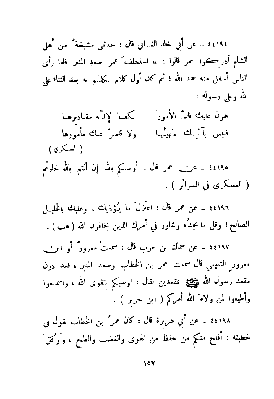 44198- عن أبي هريرة قال: كان عمر بن الخطاب يقول في خطبته: أفلح منكم من حفظ من الهوى والغضب والطمع، ووفق