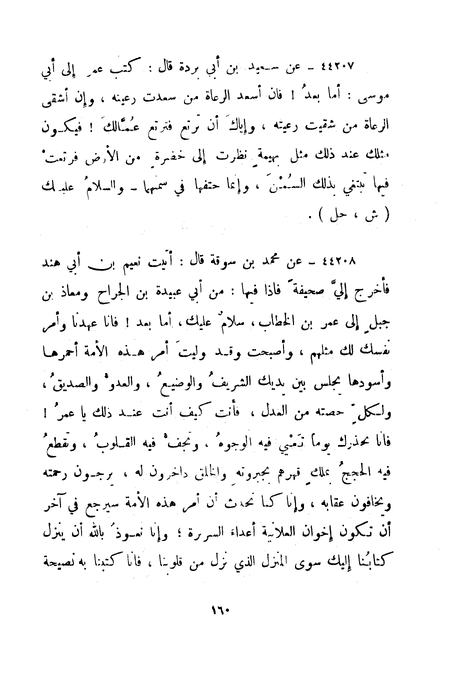 44207- عن سعيد بن أبي بردة قال: كتب عمر إلى أبي موسى: أما بعد! فإن أسعد الرعاة من سعدت رعيته، وإن أشقى الرعاة من شقيت رعيته، وإياك أن ترتع فترتع عمالك! فيكون مثلك عند ذلك مثل بهيمة نظرت إلى خضرة من الأرض فرتعت فيها تبتغي بذلك السمن، وإنما حتفها في سمنها - والسلام عليك. "ش، حل".