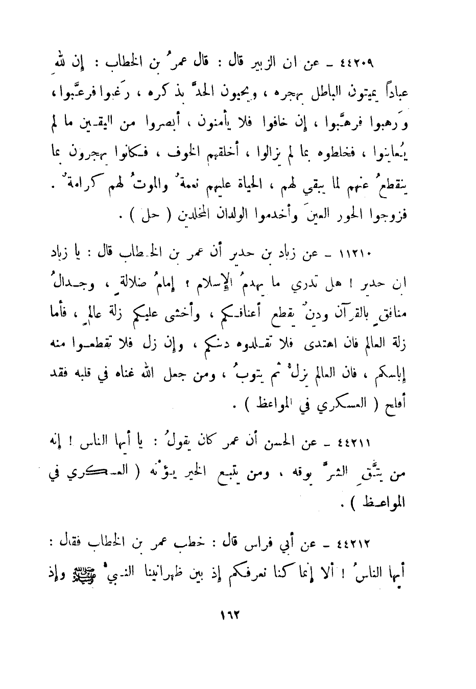 44209- عن ابن الزبير قال: قال عمر بن الخطاب: إن لله عبادا يميتون الباطل بهجره، ويحيون الحد بذكره، رغبوا فرعبوا، ورهبوا فرهبوا، إن خافوا فلا يأمنون، أبصروا من اليقين ما لم يعاينوا، فخلطوه بما لم يزالوا، أخلقهم الخوف، فكانوا يهجرون بما ينقطع عنهم لما يبقي لهم، الحياة عليهم نعمة والموت لهم كرامة. فزوجوا الحور العين وأخدموا الولدان المخلدين. "حل".