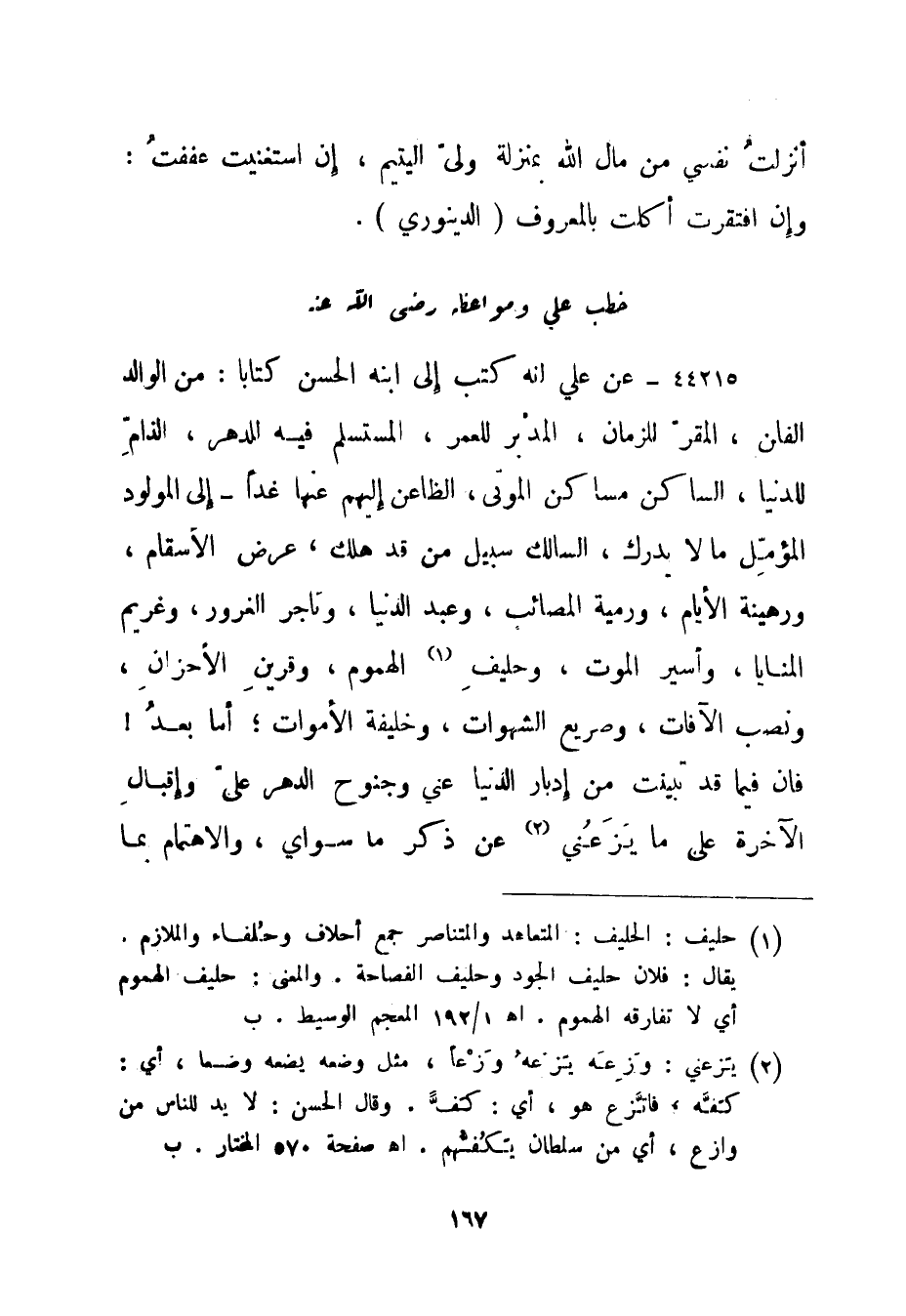 44215- عن علي أنه كتب إلى ابنه الحسن كتابا: من الوالد الفان، المقر للزمان، المدبر للعمر، المستسلم فيه للدهر، الذام للدنيا، الساكن مساكن الموتى، الظاعن إليهم عنها غدا - إلى المولود المؤمل ما لا يدرك، السالك سبيل من قد هلك، عرض الأسقام، ورهينة الأيام، ورمية المصائب، وعبد الدنيا، وتاجر الغرور، وغريم المنايا، وأسير الموت، وحليف 1 الهموم، وقرين الأحزان، ونصب الآفات، وصريع الشهوات، وخليفة الأموات؛ أما بعد! فإن فيما قد تبينت من إدبار الدنيا عني وجنوح الدهر علي وإقبال الآخرة على ما يزعني 2 عن ذكر ما سواي، والاهتمام بما