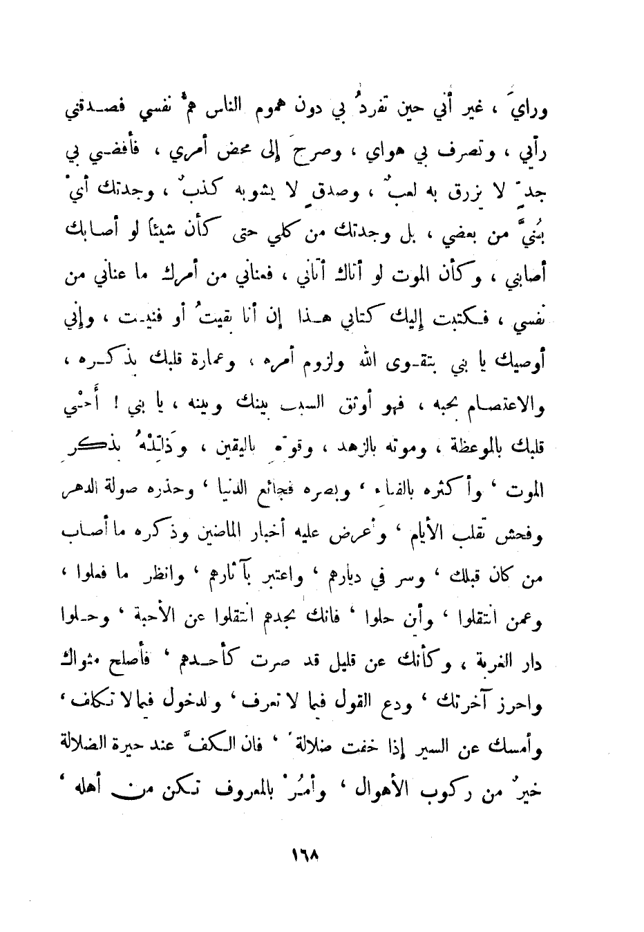 واري، غير أني حين تفرد بي دون هموم الناس هم نفسي فصدقني رأيي، وتصرف بي هواي، وصرح إلى محض أمري، فأفضي بي جد لا يرزق به لعب، وصدق لا يشوبه كذب، وجدتك أي بني من بعضي، بل وجدتك من كلي حتى كأن شيئا لو أصابك أصابني، وكأن الموت لو أتاك أتاني، فعناني من أمرك ما عناني من نفسي، فكتبت إليك كتابي هذا إن أنا بقيت أو فنيت، وإني أوصيك يا بني بتقوى الله ولزوم أمره، وعمارة قلبك بذكره، والاعتصام بحبه، فهو أوثق السبب بينك وبينه، يا بني! أحي قلبك بالموعظة، وموته بالزهد، وقوه باليقين، وذلله بذكر الموت، وأكثره بالفناء، وبصره فجائع الدنيا، وحذره صولة الدهر وفحش تقلب الأيام، وأعرض عليه أخبار الماضين وذكره ما أصاب من كان قبلك، وسر في ديارهم، واعتبر بآثارهم، وانظر ما فعلوا، وعمن انتقلوا، وأين حلوا، فإنك تجدهم انتقلوا عن الأحبة، وحلوا دار الغربة، وكأنك عن قليل قد صرت كأحدهم، فأصلح مثواك واحرز آخرتك، ودع القول فيما لا تعرف، والدخول فيما لا تكلف، وأمسك عن السير إذا خفت ضلالة، فإن الكف عند حيرة الضلالة خير من ركوب الأهوال، وأمر بالمعروف تكن من أهله،