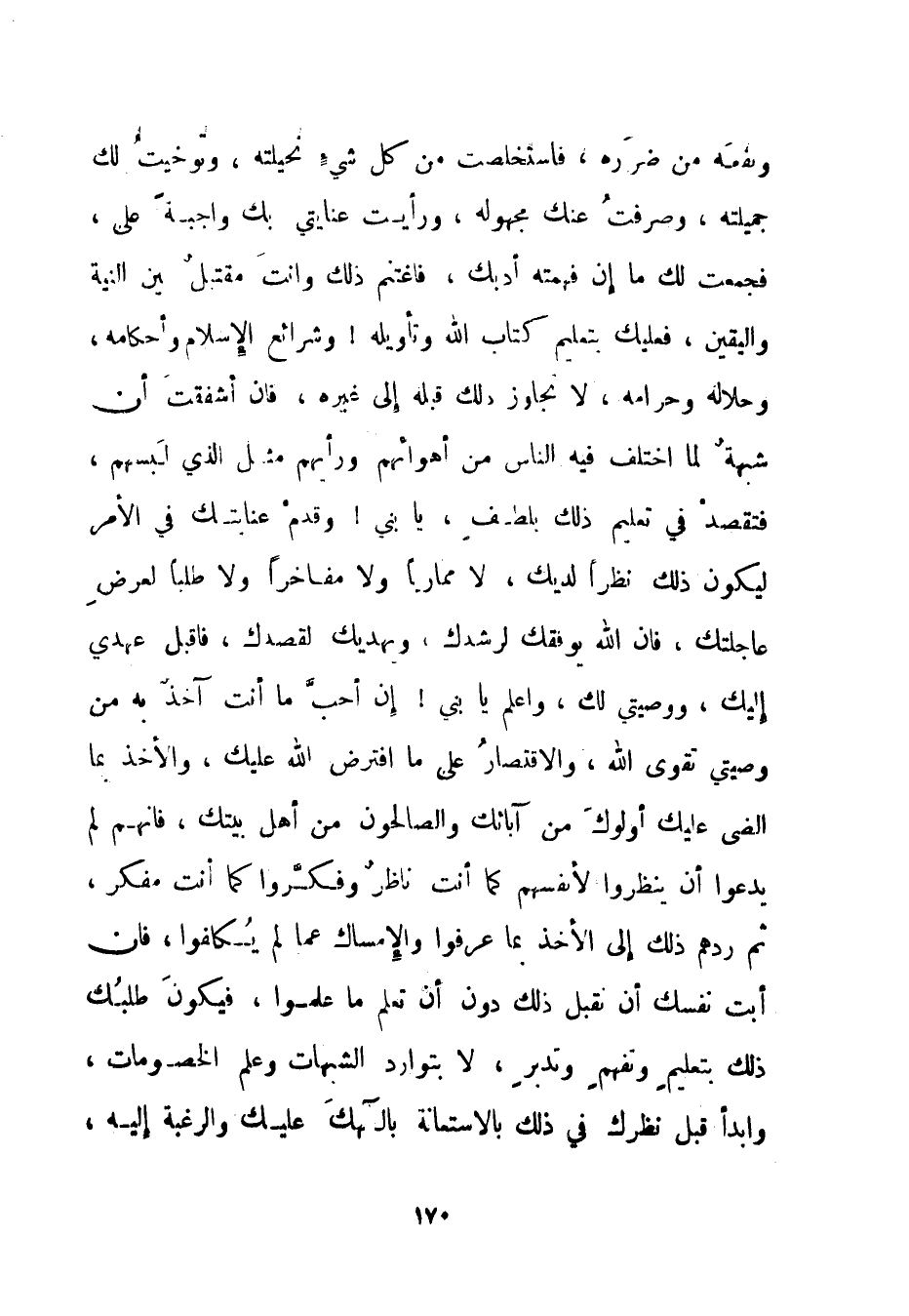 ونفعه من ضره، فاستخلصت من كل شيء نحيلته، وتوخيت لك جميلته، وصرفت عنك مجهوله، ورأيت عنايتي بك واجبة علي، فجمعت لك ما إن فهمته أدبك، فاغتنم ذلك وأنت مقتبل بين النية واليقين، فعليك بتعليم كتاب الله وتأويله! وشرائع الإسلام وأحكامه، وحلاله وحرامه، لا تجاوز ذلك قبله إلى غيره، فإن أشفقت أن شبهة لمت اختلف فيه الناس من أهوائهم ورأيهم مثل الذي لبسهم، فتقصد في تعليم ذلك بلطف، يا بني! وقدم عنايتك في الأمر ليكون ذلك نظرا لديك، لا مماريا ولامفاخرا ولا طلبا لعرض عاجلتك، فإن الله يوفقك لرشدك، ويهديك لقصدك، فاقبل عهدي إليك، ووصيتي لك، واعلم يا بني! إن أحب ما أنت آخذ به من وصيتي تقوى الله، والاقتصار على ما افترض الله عليك، والأخذ بما الضى؟؟ عليك أولوك من آبائك والصالحون من أهل بيتك، فإنهم لم يدعوا أن ينظروا لأنفسهم كما أنت ناظر وفكروا كما أنت مفكر، ثم ردهم ذلك إلى الأخذ بما عرفوا والإمساك عما لم يكلفوا، فإن أبت نفسك أن تقبل ذلك دون أن تعلم ما علموا، فيكون طلبك ذلك بتعليم وتفهم وتدبر، لا بتوارد الشبهات وعلم الخصومات، وابدأ قبل نظرك في ذلك بالاستعانة بالهك عليك والرغبة إليه،