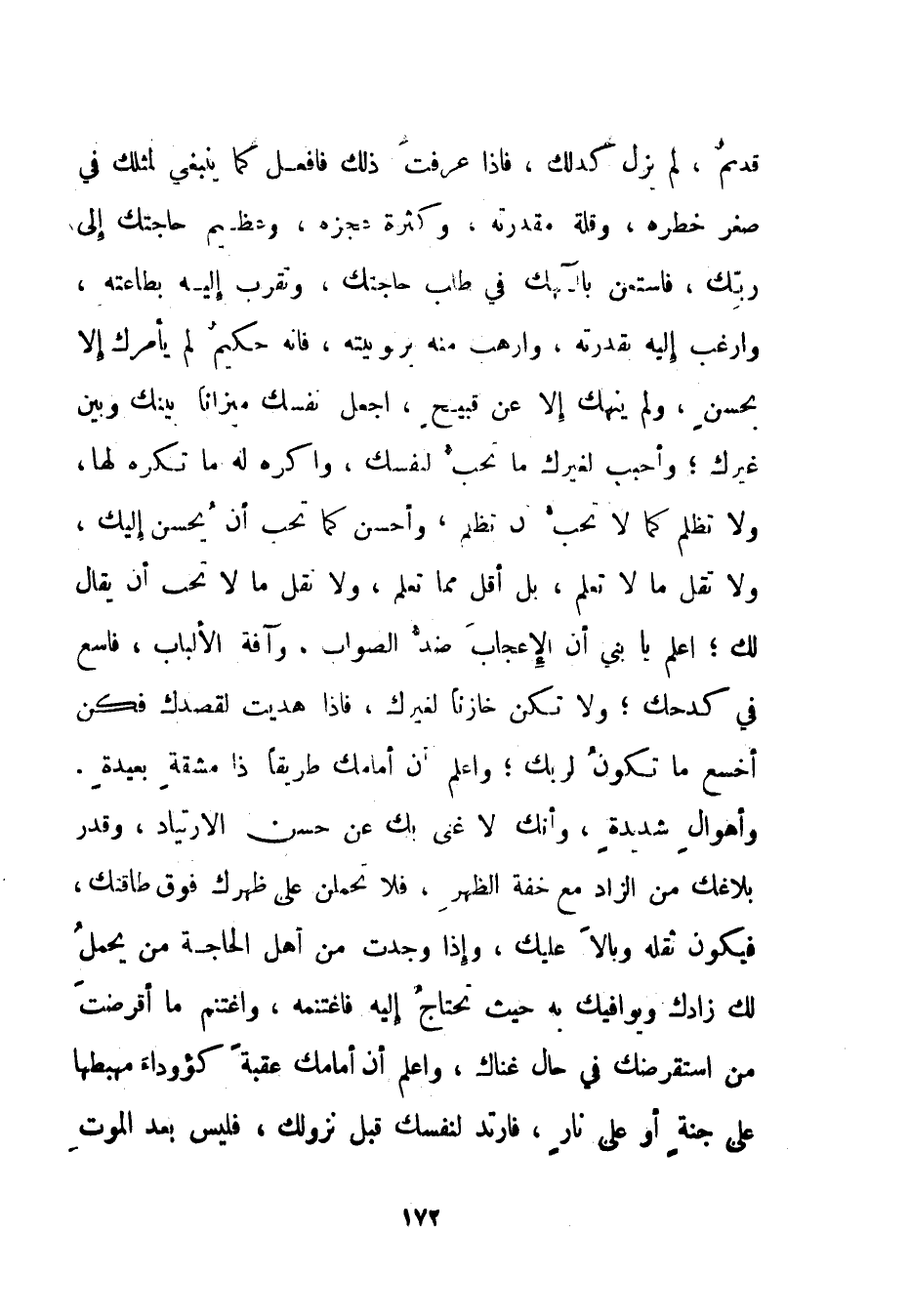 قديم، لم يزل كذلك، فإذا عرفت ذلك فافعل كما ينبغي لمثلك في صغر خطره، وقلة مقدرته، وكثرة عجزه، وعظيم حاجتك إلى ربك، فاستعن بالهك في طلب حاجتك، وتقرب إليه بطاعته، وارغب إليه بقدرته، وارهب منه بروئيته، فإنه حكيم لم يأمرك إلا بحسن، ولم ينهك إلا عن قبيح، اجعل نفسك ميزانا بينك وبين غيرك؛ وأحبب لغيرك ما تحب لنفسك، واكره له ما تكره لها، ولا تظلم كما لا تحب أن تظلم، وأحسن كما تحب أن يحسن إليك، ولا تقل ما لا تعلم، بل أقل مما تعلم، ولا تقل ما لا تحب أن يقال لك؛ اعلم يا بني أن الإعجاب ضد الصواب، وآفة الألباب، فاسع في كدحك؛ ولا تكن خازنا لغيرك، فإذا هديت لقصدك فكن أخشع ما تكون لربك؛ واعلم أن أمامك طريقا ذا مشقة بعيدة. وأهوال شديدة، وأنك لا غنى بك عن حسن الارتياد، وقدر بلاغك من الزاد مع خفة الظهر، فلا تحملن على ظهرك فوق طاقتك، فيكون ثقله وبالا عليك، وإذا وجدت من أهل الحاجة من يحمل لك زادك ويوافيك به حيث تحتاج إليه فاغتنمه، واغتنم ما أقرضت من استقرضك في حال غناك، واعلم أن أمامك عقبة كؤوداء مهبطها على جنة أو على نار، فارتد لنفسك قبل نزولك، فليس بعد الموت