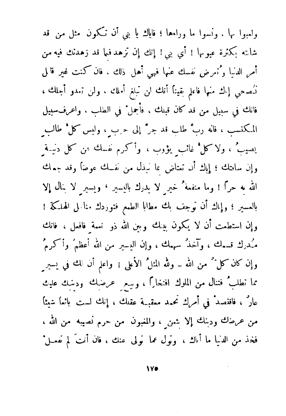 ولعبوا بها، ونسوا ما وراءها؛ فإياك يا بني أن تكون مثل من قد شابته بكثرة عيوبها! أي بني! إنك إن تزهد فيما قد زهدتك فيه من أمر الدنيا وتعرض نفسك عنها فهي أهل ذلك، فإن كنت غير قابل نصحي إياك منها فاعلم يقينا أنك لن تبلغ أملك، ولن تعدو أجلك، فإنك في سبيل من قد كان قبلك، فأجمل في الطلب، واعرف سبيل المكتسب، فإنه رب طلب قد جر إلى حرب، وليس كل طالب يصيب، ولا كل غائب يؤوب، وأكرم نفسك عن كل دنية وإن ساقتك؛ إياك أن تعتاض بما تبذل من نفسك عوضا وقد جمعك الله به حرا! وما منفعة خير لا يدرك باليسير، ويسير لا ينال إلا بالعسير؛ وإياك أن توجف بك مطايا الطمع فتوردك مناهل الهلكة! وإن استطعت أن لا يكون بينك وبين الله ذو نعمة فافعل، فإنك مدرك قسمك، وآخذ سهمك، وإن اليسير من الله أعظم وأكرم وإن كان كل من الله - ولله المثل الأعلى! واعلم أن لك في يسير مما تطلب فتنال من الملوك افتخارا، وبيع عرضك ودينك عليك عار، فاقتصد في أمرك تحمد معقبة عقلك، إنك لست بائعا شيئا من عرضك ودينك إلا بثمن، والمغبون من حرم نصيبه من الله، فخذ من الدنيا ما أتاك، وتول عما تولى عنك، فإن أنت لم تفعل