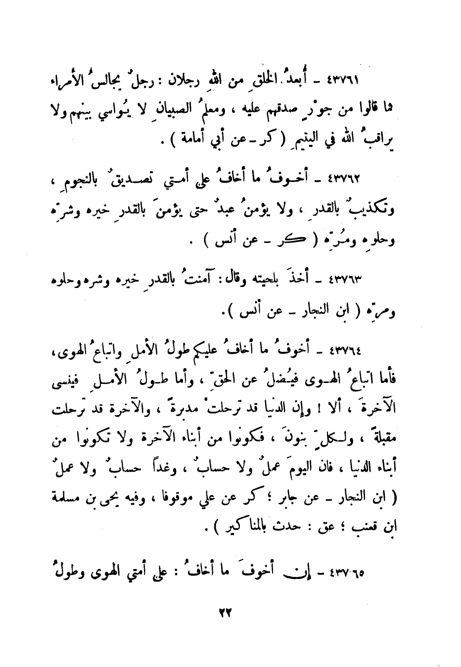43762- أخوف ما أخاف على أمتي تصديق بالنجوم، وتكذيب بالقدر، ولا يؤمن عبد حتى يؤمن بالقدر خيره وشره وحلوه ومره. "كر - عن أنس".