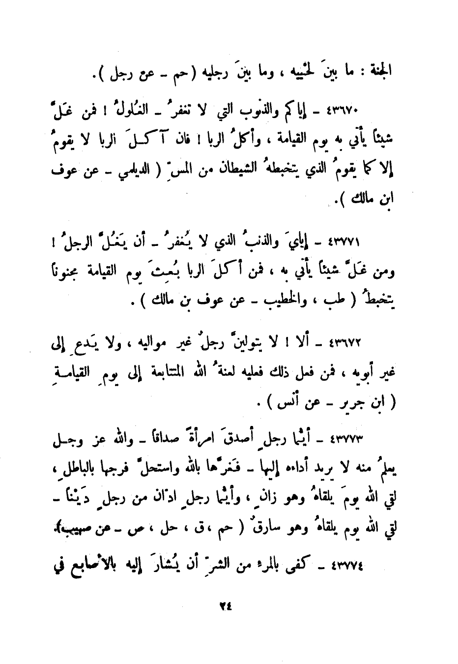43771- إياي والذنب الذي لا يغفر - أن يغل الرجل! ومن غل شيئا يأتي به، فمن أكل الربا بعث يوم القيامة مجنونا يتخبط. "طب، والخطيب - عن عوف بن مالك".