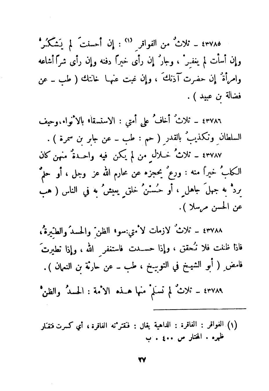 43785- ثلاث من الفواقر 1: إن أحسنت لم يشكر وإن أسأت لم يغفر، وجار إن رأى خيرا دفنه وإن رأى شرا أشاعه وامرأة إن حضرت آذتك، وإن غبت عنها خانتك. "طب - عن فضالة بن عبيد".